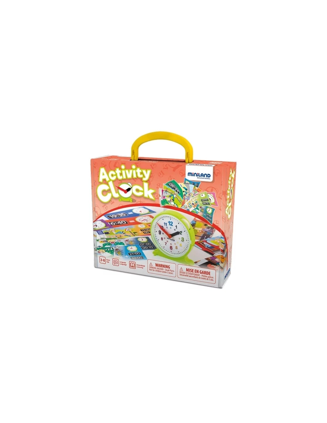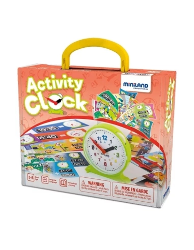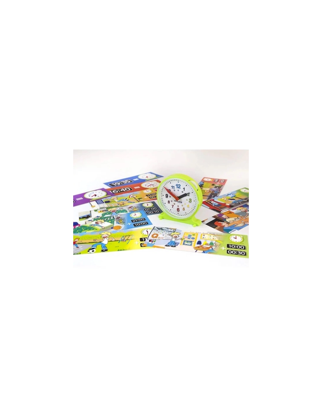Le cadran est divisé en heures et minutes avec des chiffres clairs de différentes couleurs. Il est livré avec 12 feuilles de travail illustrant les activités quotidiennes pour aider les enfants à lire l'heure de manière analogique et numérique.