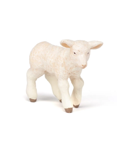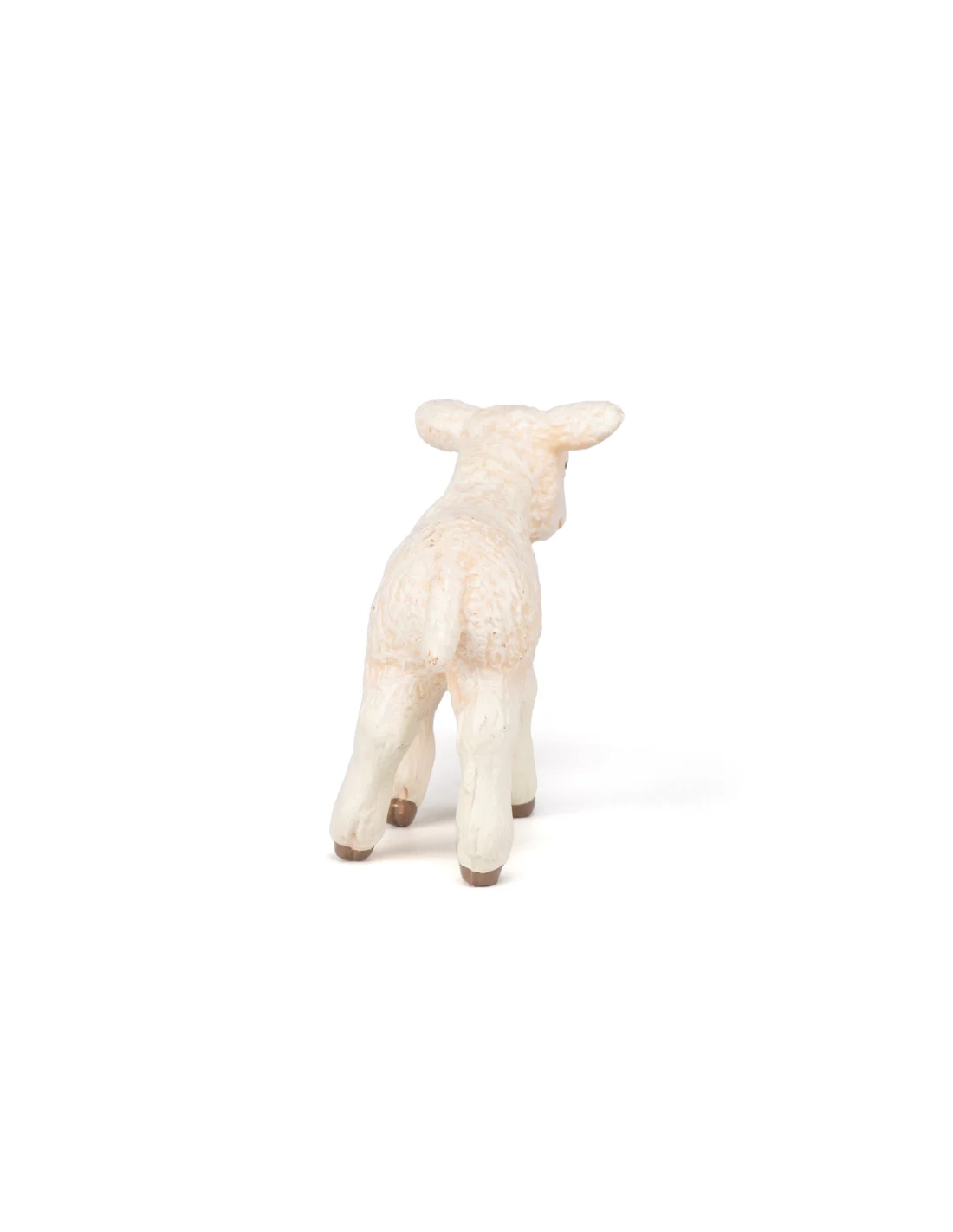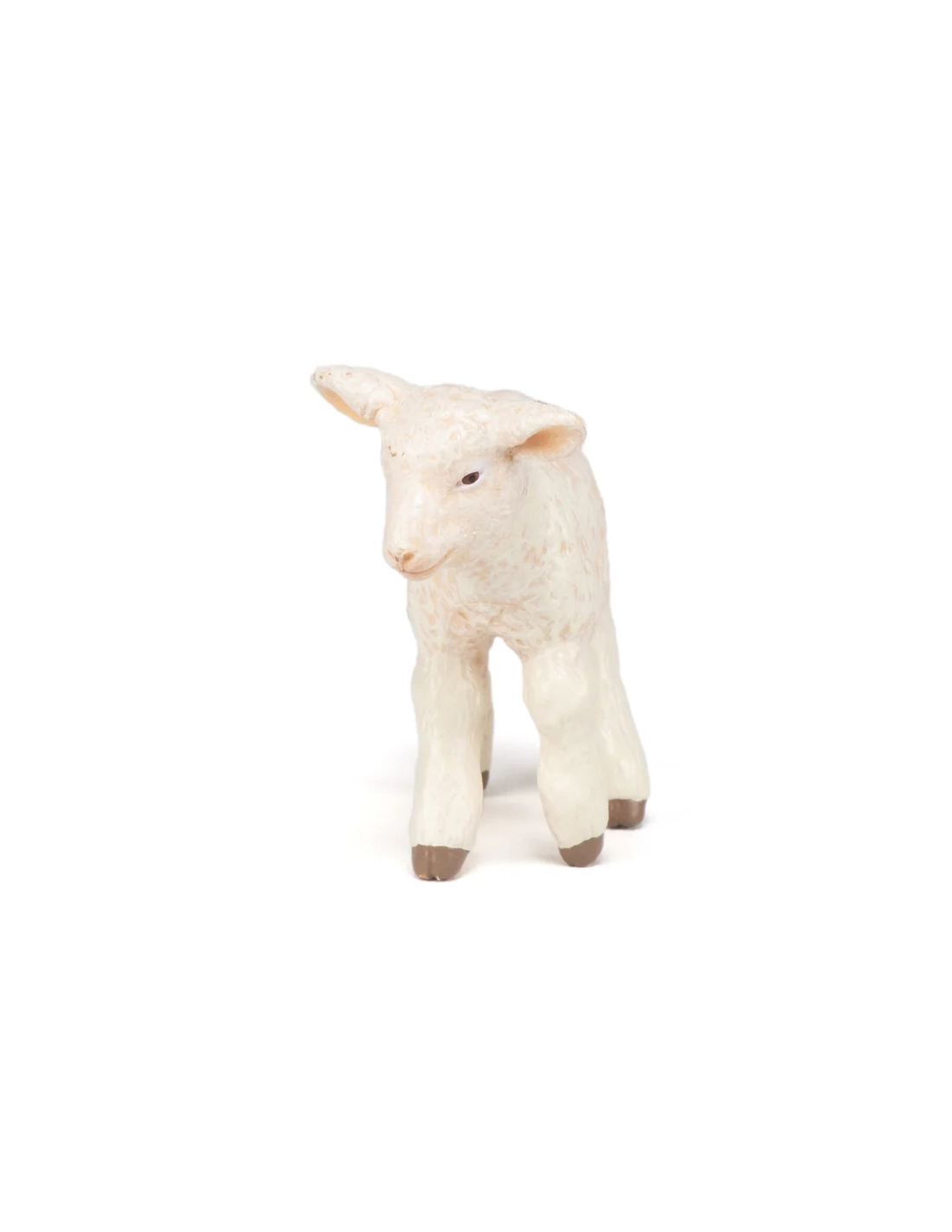 L'agneau est un animal nidifuge : il naît capable de se tenir debout et de se déplacer dans les heures qui suivent sa naissance. La figurine le représente debout — exactement la posture qu'il adopte dès ses premiers jours pour suivre sa mère et allaiter.