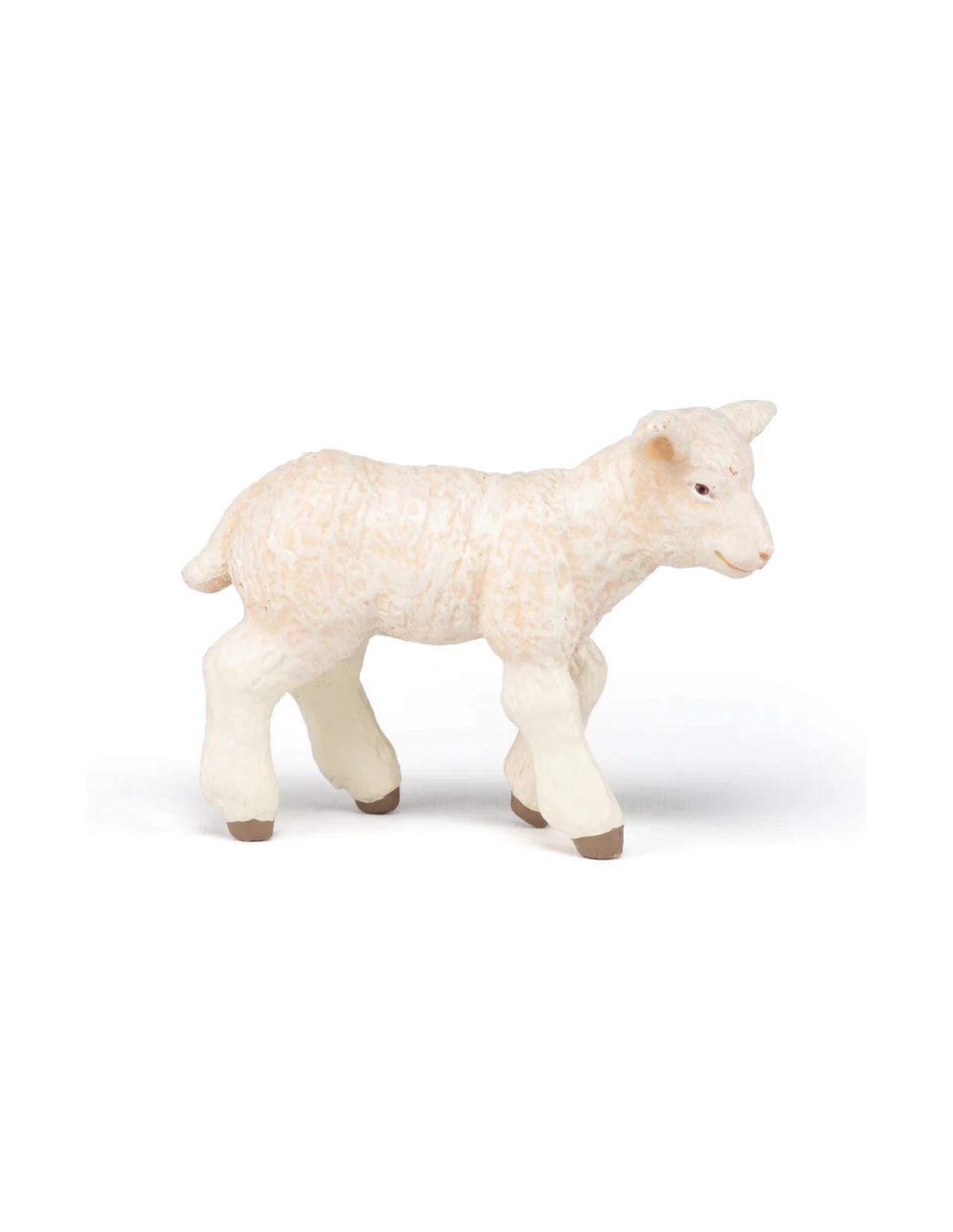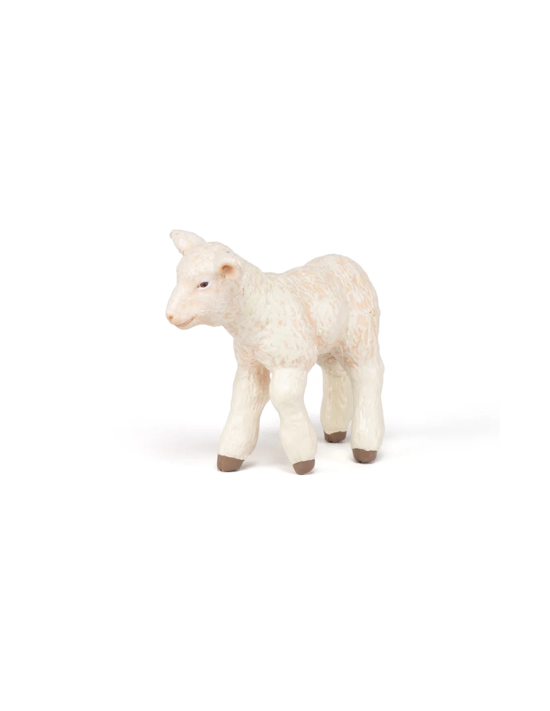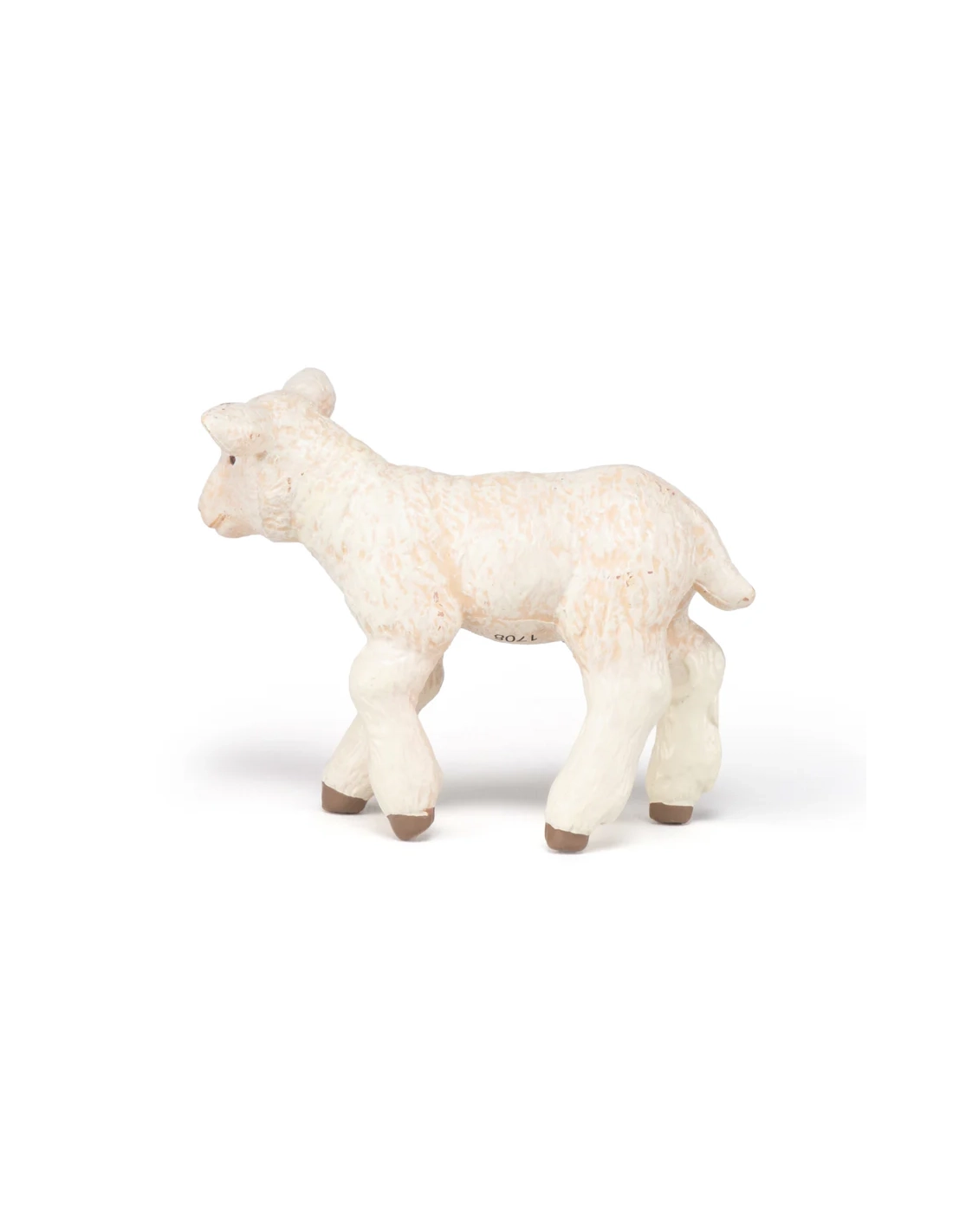 L'agneau naît avec une toison courte et lisse qui ne ressemble pas encore à la toison bouclée de l'adulte. Les premières boucles commencent à apparaître après quelques semaines. La figurine Papo représente cette toison juvénile — permettant de distinguer clairement l'agneau de la brebis adulte de la même collection.