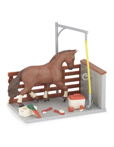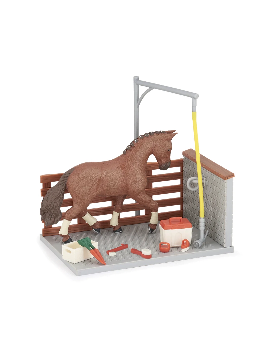 Ce playset Papo représente une aire de douche pour chevaux, un espace indispensable dans une écurie pour laver, soigner ou rafraîchir les animaux après l’entraînement. Le set comprend la zone de douche, les outils de pansage et plusieurs accessoires pour créer une scène réaliste autour des soins quotidiens.