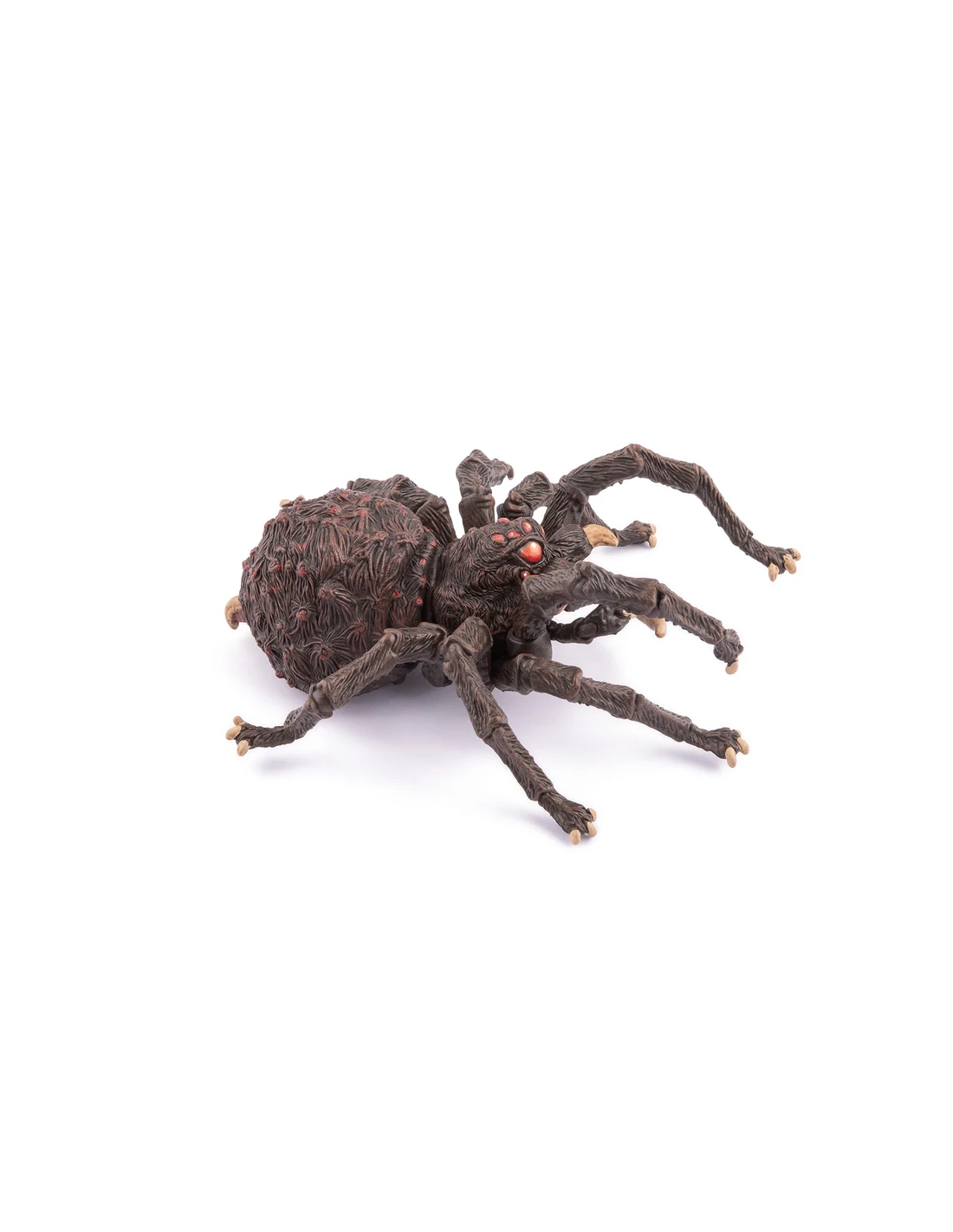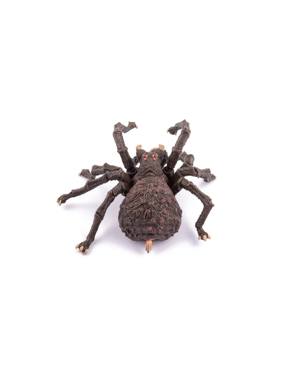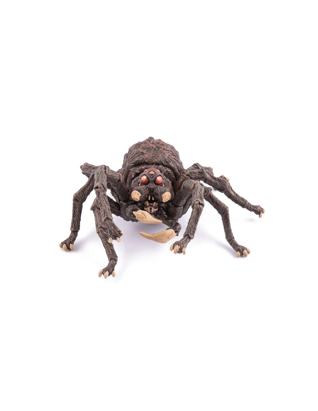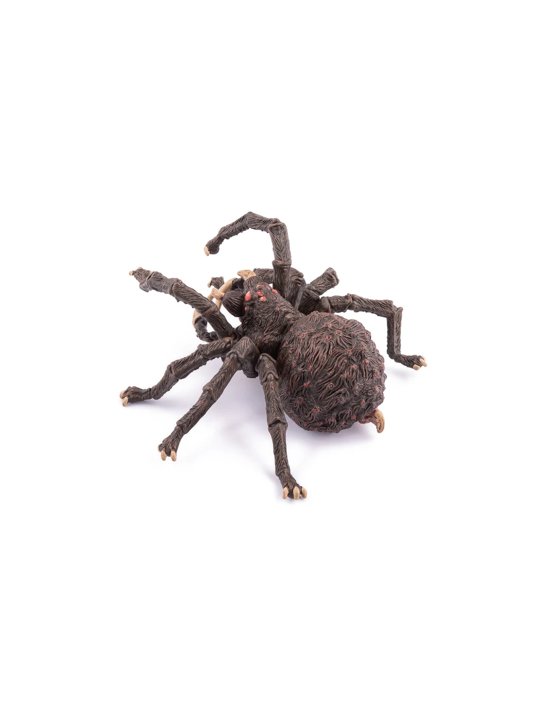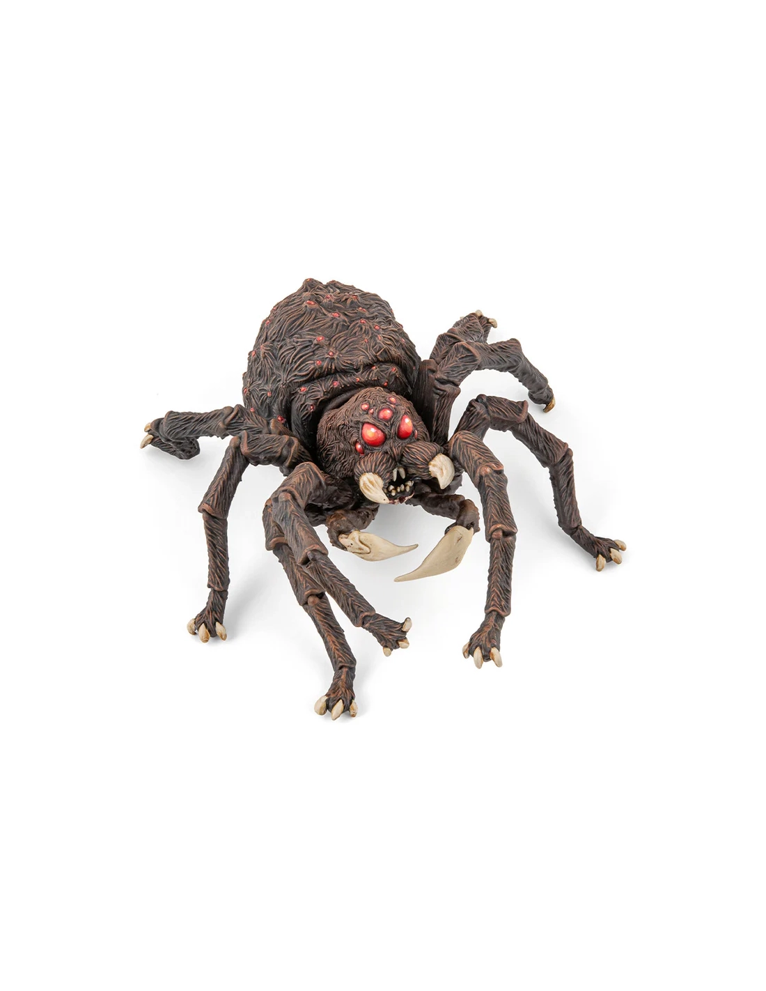 Les huit yeux d'Arachnos sont peints d'un rouge profond — la seule note de couleur chaude sur un corps entièrement sombre. Dans l'obscurité d'une grotte ou d'un donjon, c'est ce qu'on verrait en premier : huit points lumineux rouges, fixes, qui regardent. Papo a compris que la peur de l'araignée n'est pas dans sa taille — elle est dans la façon dont elle regarde.