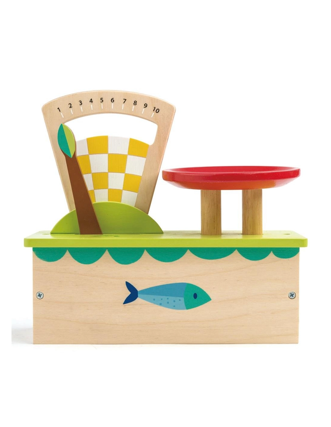 Le cadran numéroté de 1 à 10, avec son design damier jaune et blanc, permet aux enfants de découvrir les nombres tout en pesant leurs marchandises. La base verte pomme, décorée d'un joli poisson et d'une pomme, apporte une touche ludique à ce jouet éducatif.