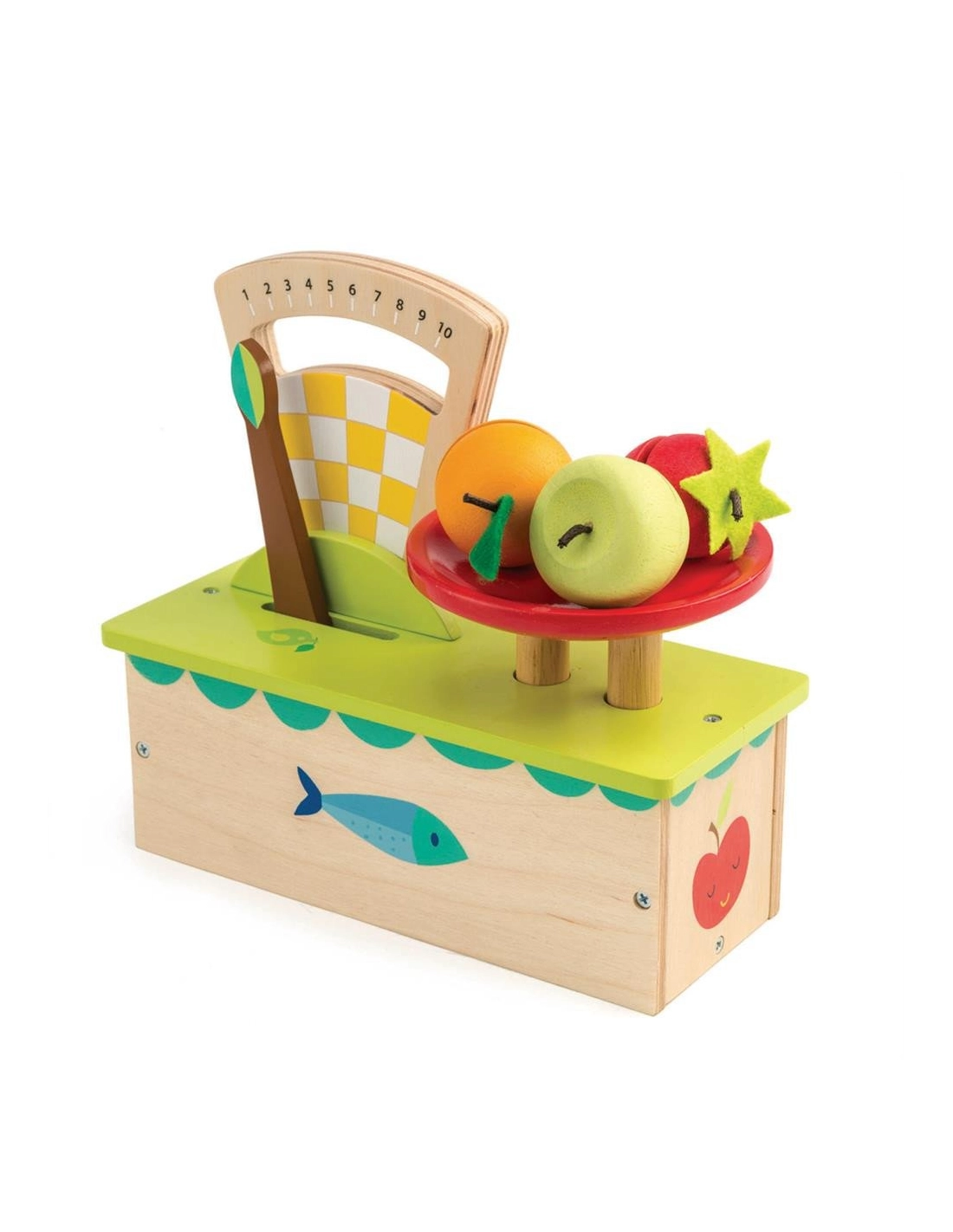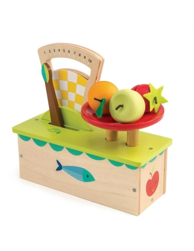 Une magnifique balance en bois avec 3 fruits à découper pour jouer à la marchande : pomme, orange et fraise. Avec son plateau rouge et son cadran numéroté de 1 à 10, elle permet aux enfants d'apprendre à peser tout en s'amusant !