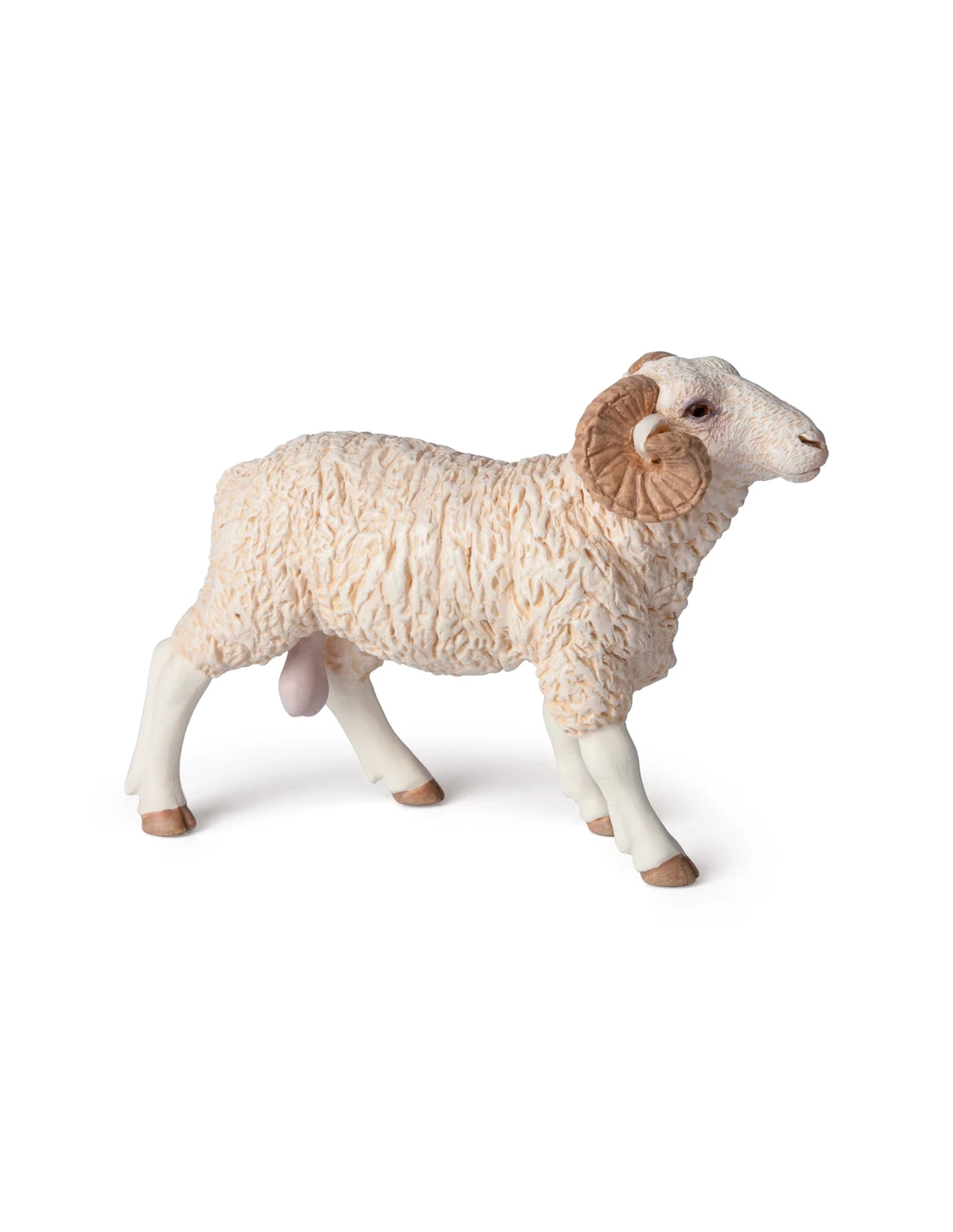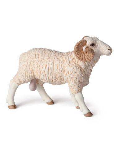 Le bélier est nettement plus grand et plus lourd que la brebis — 80 à 160 kg selon les races, contre 40 à 100 kg pour la brebis. Ce dimorphisme sexuel est l'un des plus marqués parmi les animaux de ferme. La figurine Papo le restitue dans ses proportions : le bélier est clairement plus massif que la brebis de la même collection.