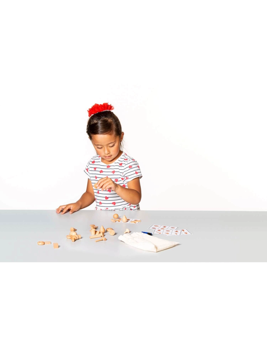 Le Jeu de Formes Géométriques en Bois Montessori - Sacs Mystère est une activité sensorielle captivante, conçue pour affiner la perception tactile des enfants et enrichir leur vocabulaire géométrique. Adapté pour les enfants dès 3 ans, ce jeu est idéal pour une utilisation à la maison ou en classe.