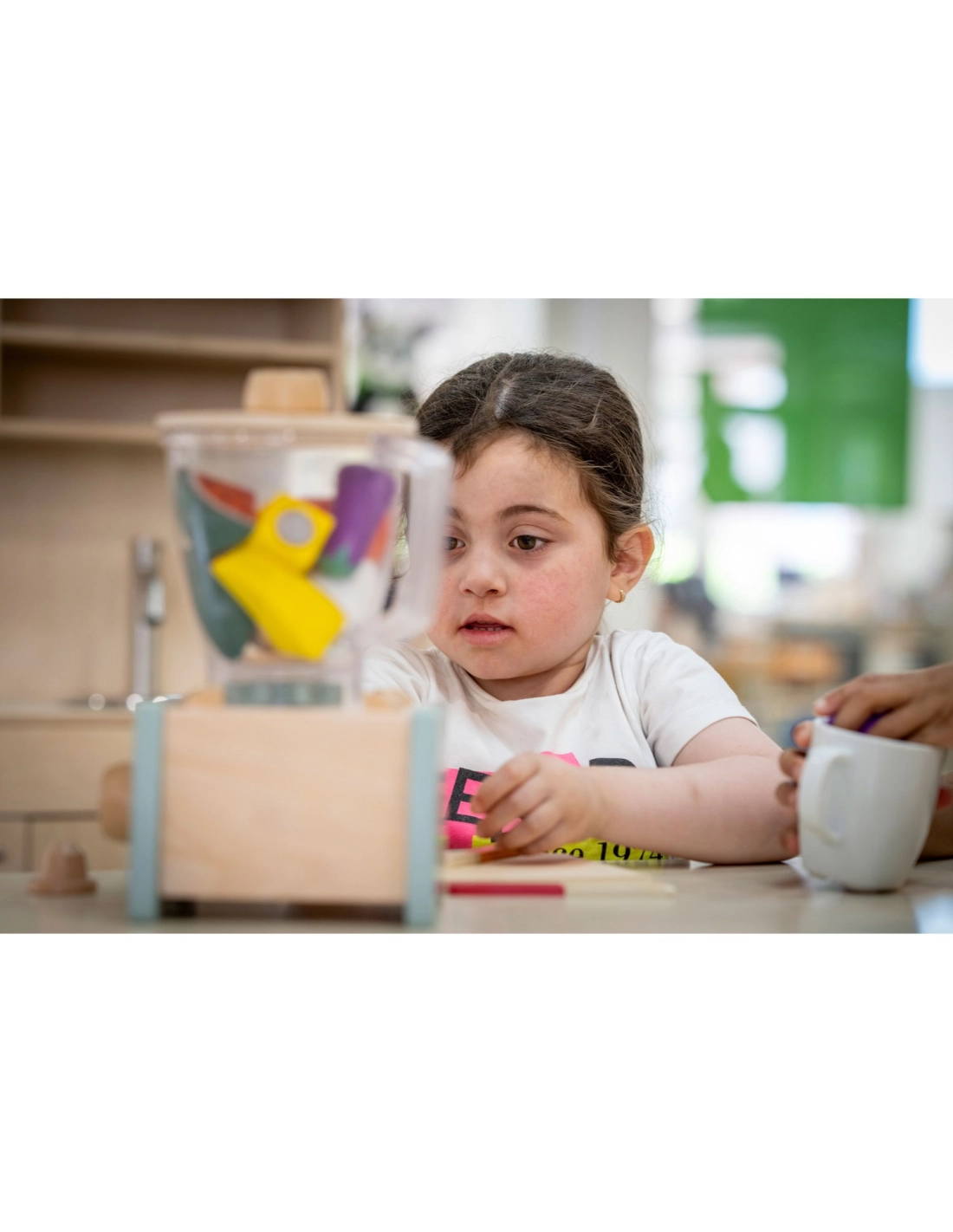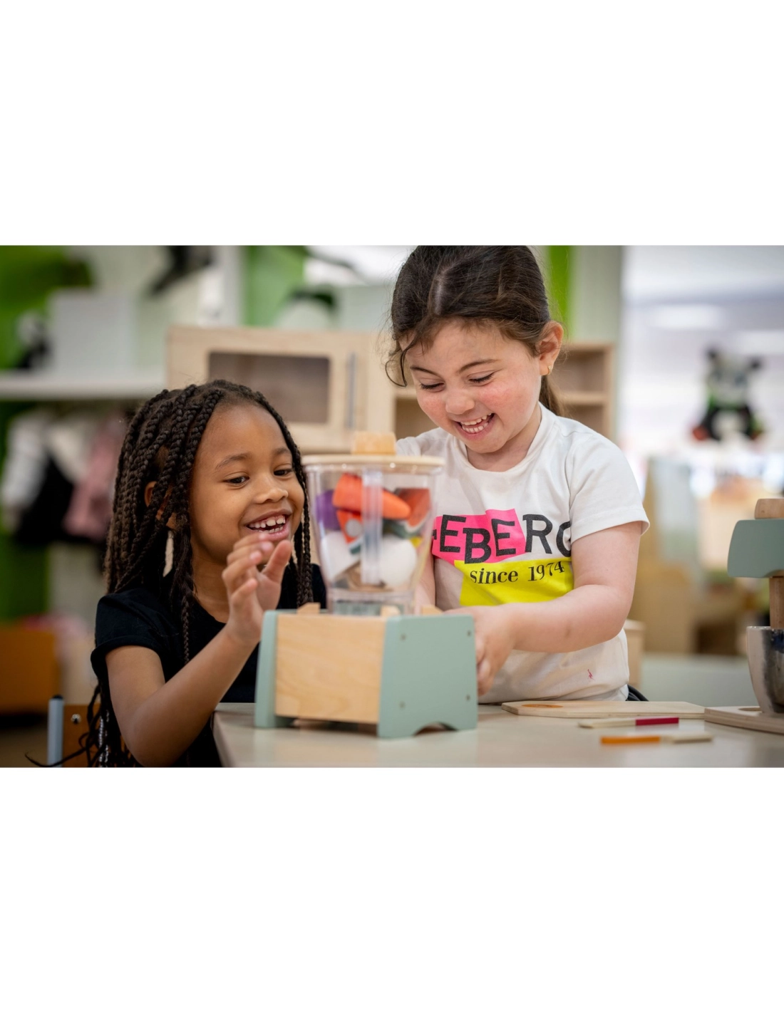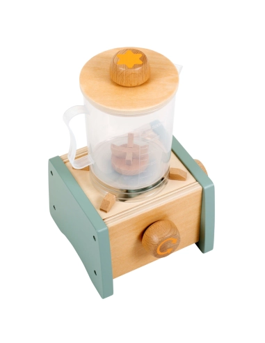 Blender en bois de haute qualité pour jeux d'imitation et dinette. Avec son bol amovible et son mécanisme manuel sécurisé, il permet aux enfants de développer leur imagination en faisant semblant de mixer des fruits et en préparant de délicieux smoothies imaginaires.