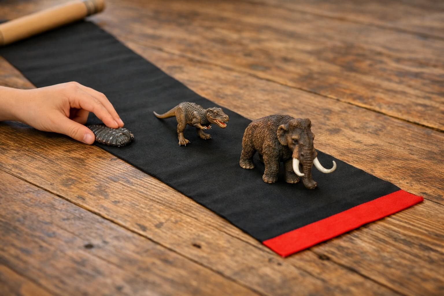 L’éducateur ou le parent déroule lentement, très lentement, une bobine de tissu noir de plusieurs dizaines de mètres de long. Chaque mètre représente des millions d’années. L’enfant regarde le ruban se dérouler à travers la pièce, en silence. Le noir représente le vide, l’attente, l’eau sans vie, puis la lente formation des roches. Et tout à la fin de cet immense ruban noir, sur les tout derniers centimètres, se trouve une minuscule bande de couleur différente (souvent rouge). Cette toute petite bande, c’est l’apparition de l’être humain.