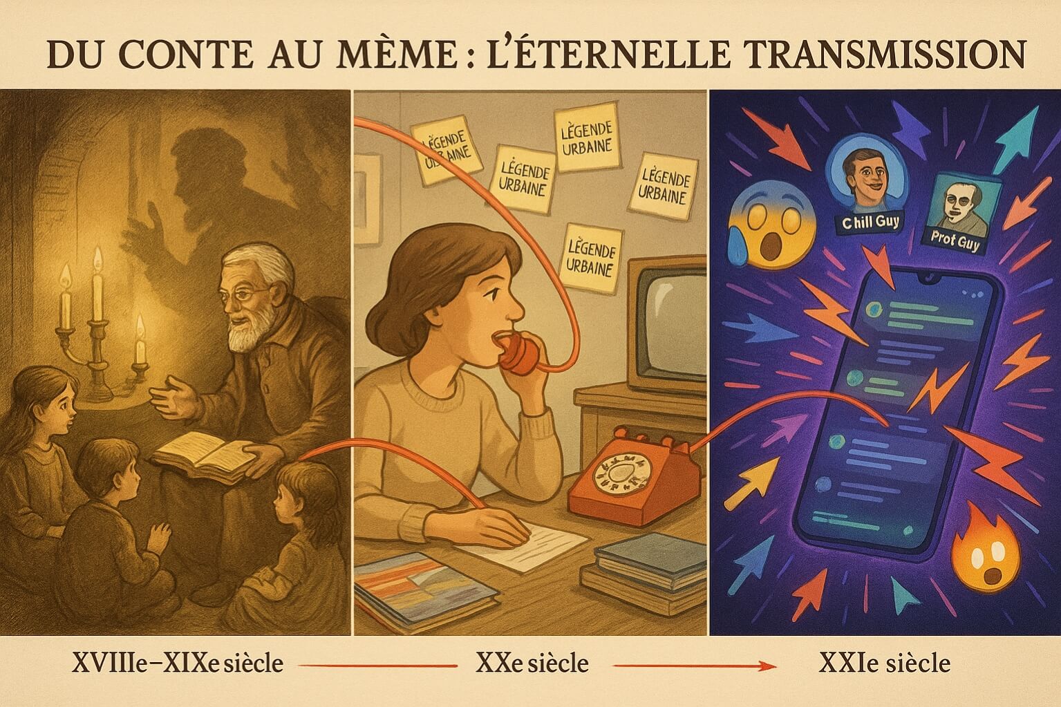 Bienvenue dans le folklore 2.0 : même logique de transmission, nouveaux canaux. Les mécanismes ancestraux de la rumeur et du mythe fonctionnent toujours, mais à la vitesse de la fibre optique.