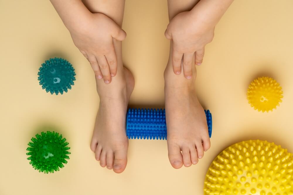 - Pression ponctuelle : placer un rouleau massage sensoriel hérisson sur la plante du pied, puis le faire rouler jusqu’au talon. Idéal pour activer les mécano‑récepteurs profonds sans douleur.