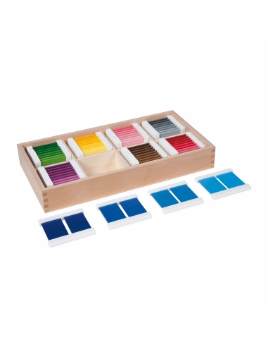 Un matériel Montessori. Avec la leçon en trois temps Montessori, l'enfant s'approprie le vocabulaire des couleurs. Vous pouvez lui proposer une activité Montessori de mise en paire, des jeux d'association avec objets du quotidien. Cet ensemble propose des couleurs secondaires...
