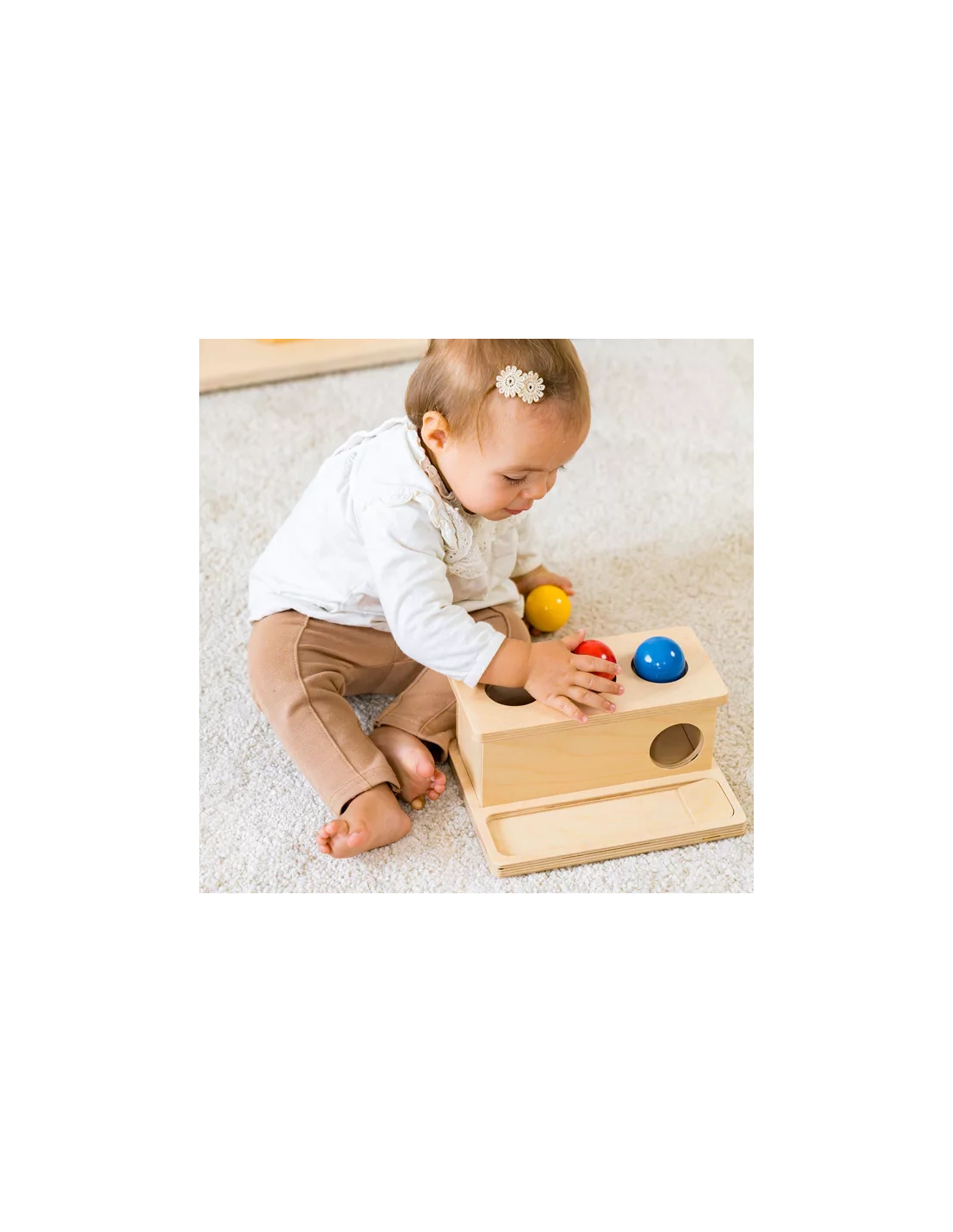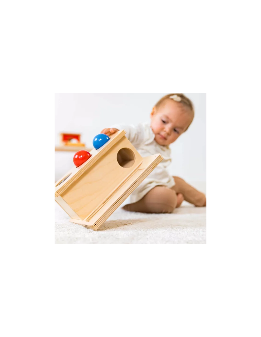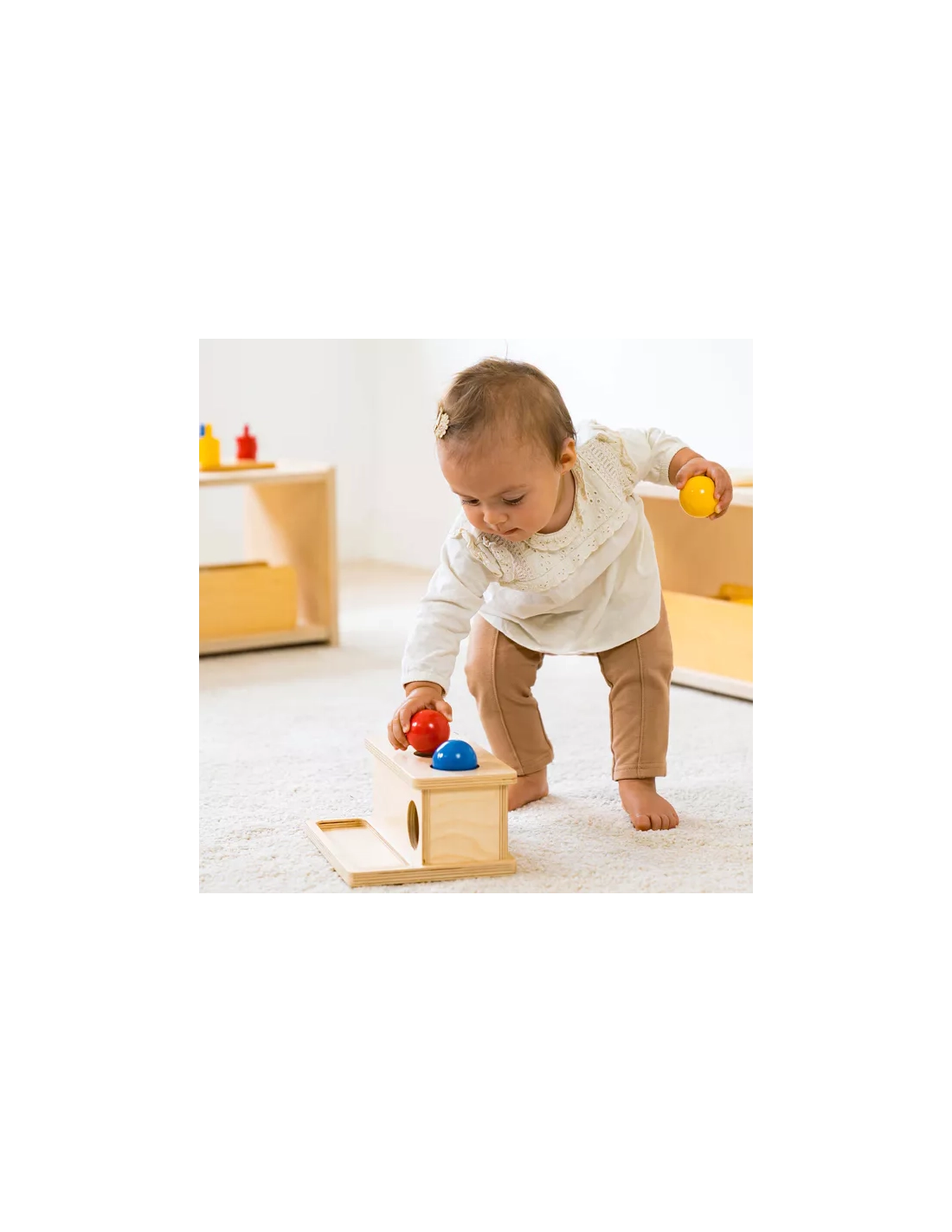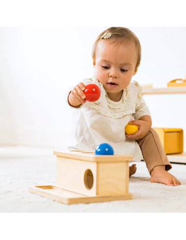 Votre enfant place une balle colorée (rouge ou bleue) au-dessus d'un trou et la pousse avec son doigt. La balle disparaît dans la boîte, puis peut être récupérée en ouvrant le tiroir coulissant. Cette action simple mais riche développe de nombreuses compétences essentielles.