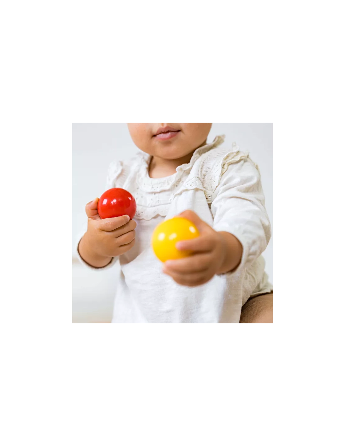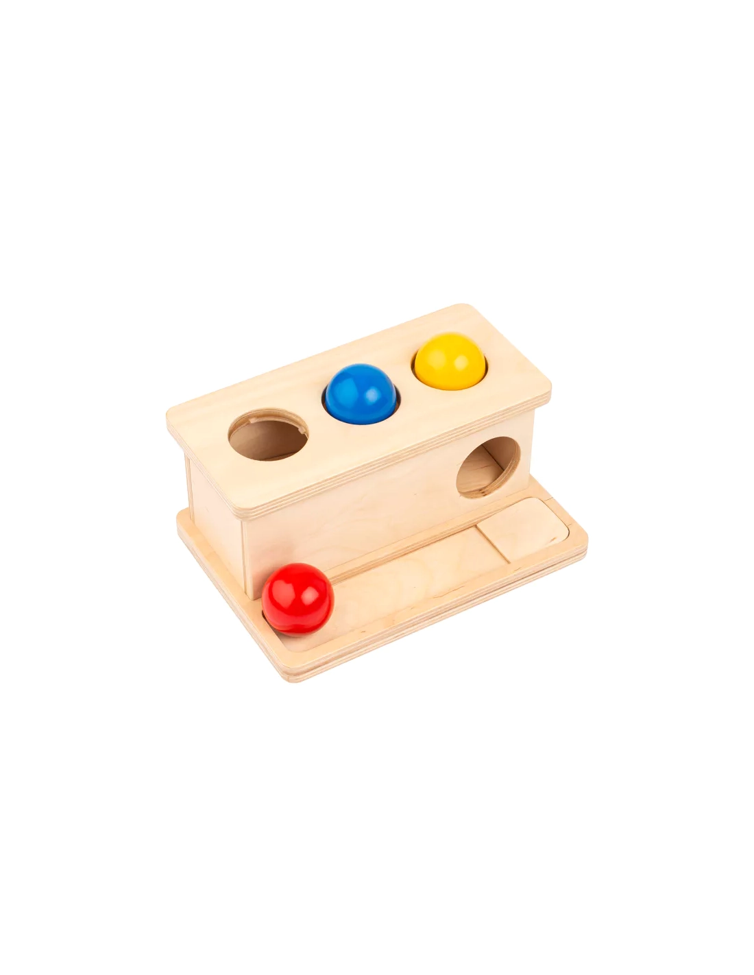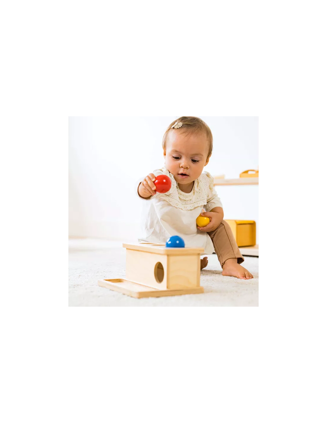 Votre enfant place une balle colorée (rouge ou bleue) au-dessus d'un trou et la pousse avec son doigt. La balle disparaît dans la boîte, puis peut être récupérée en ouvrant le tiroir coulissant. Cette action simple mais riche développe de nombreuses compétences essentielles.
