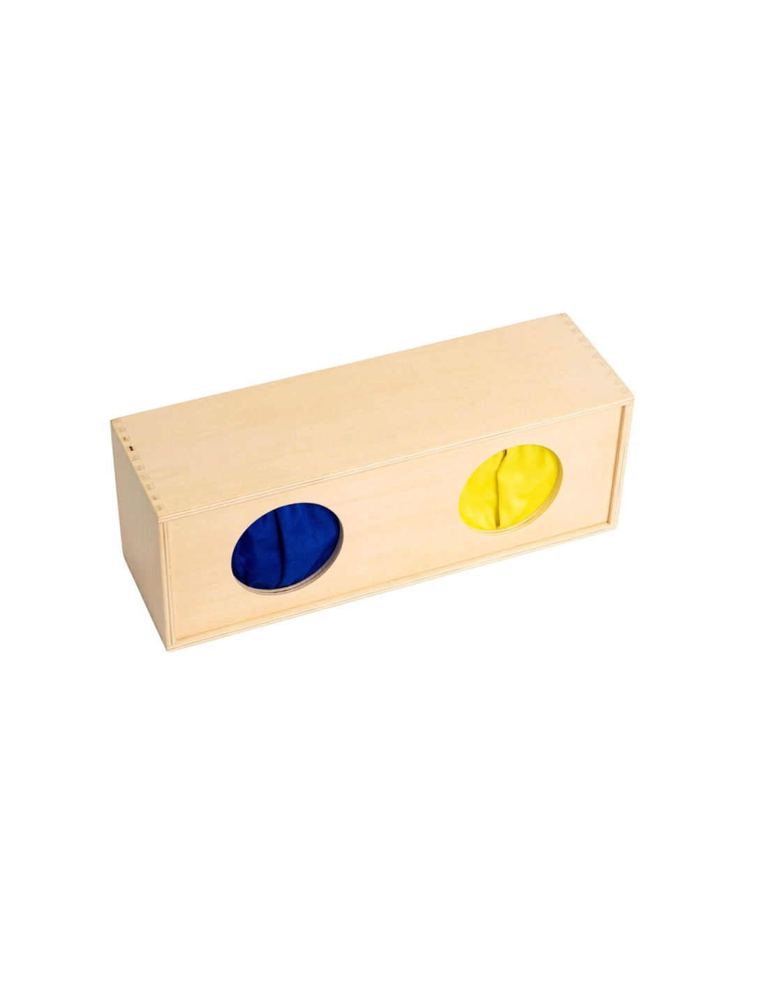 - Préparation : Placez les objets inclus dans la boîte sensorielle à travers les ouvertures circulaires recouvertes de tissus colorés.