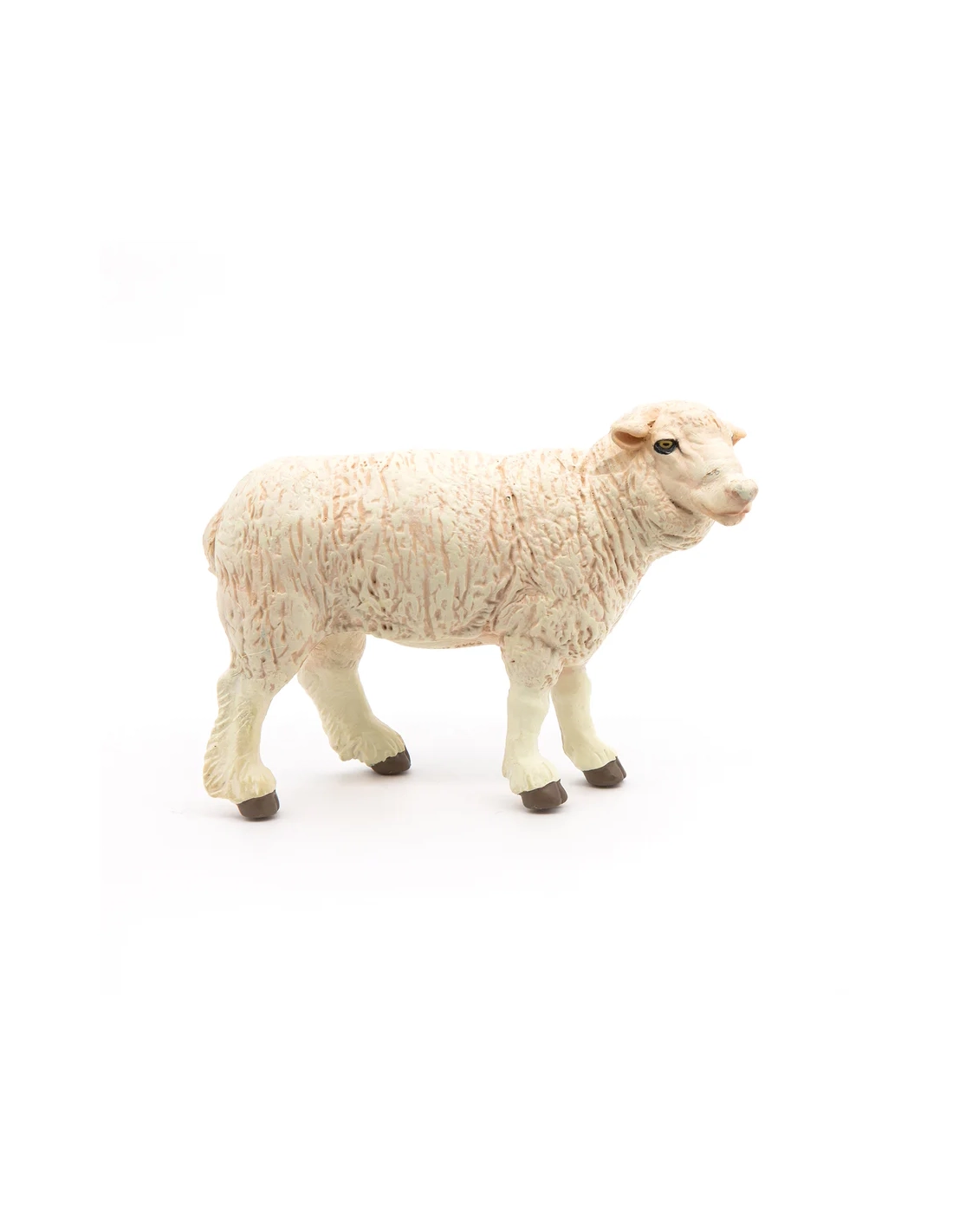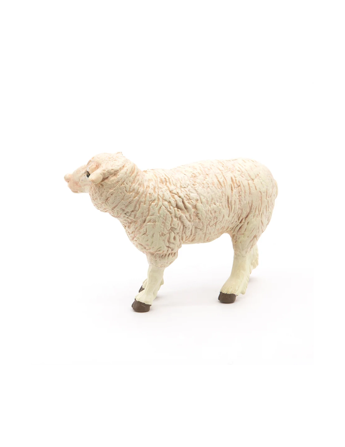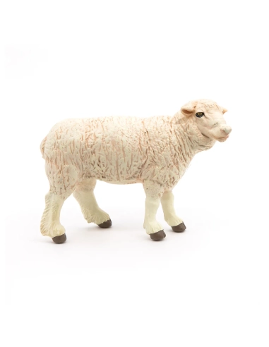 La brebis (femelle) est généralement sans cornes, ou à cornes très réduites selon la race — contrairement au bélier qui porte de grandes cornes spiralées pesant parfois plusieurs kilos. Cette figurine représente une brebis adulte dans sa morphologie naturelle. Un détail anatomique utile pour expliquer le dimorphisme sexuel à un enfant : même espèce, morphologies différentes selon le sexe.