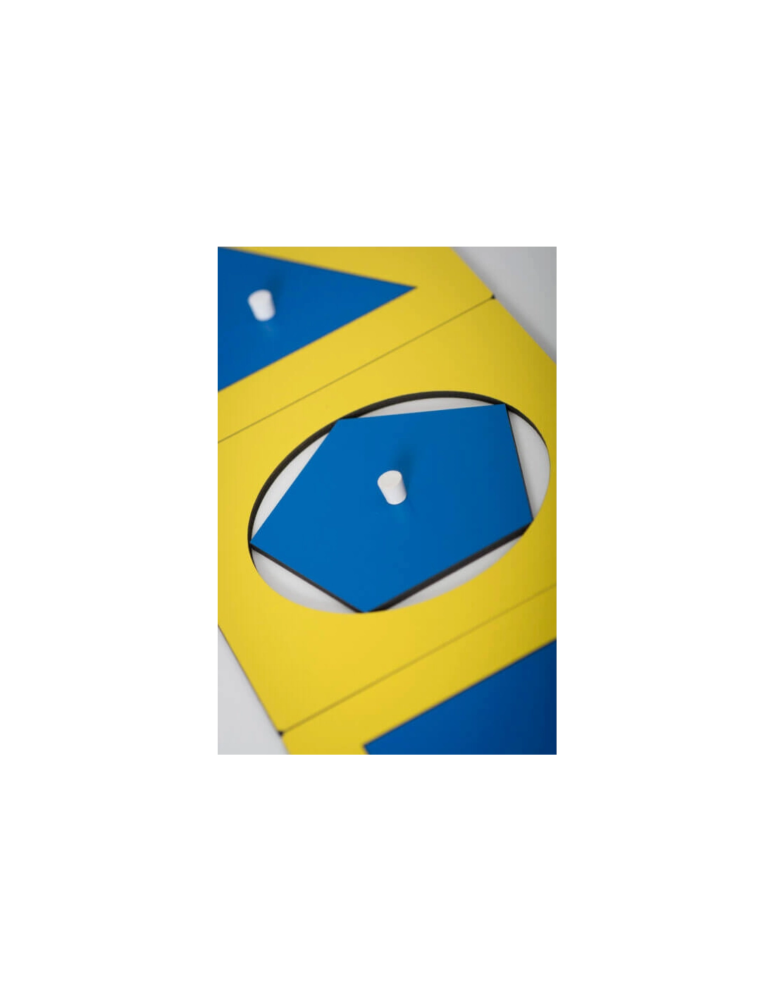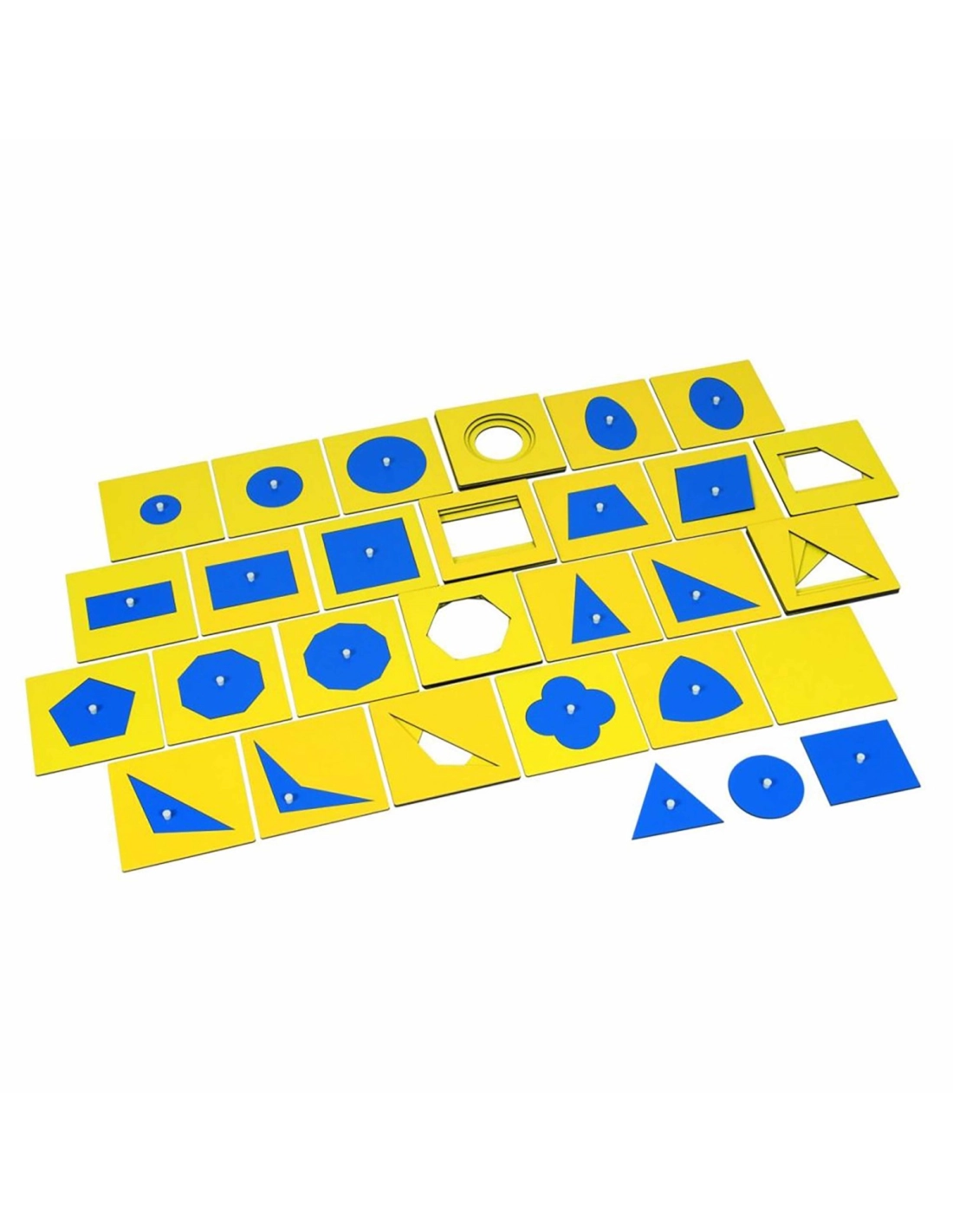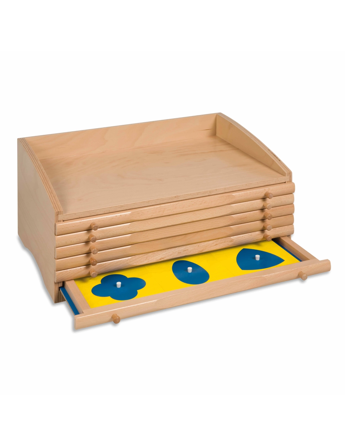 Meuble éducatif de six tiroirs avec 35 formes géométriques uniques pour une exploration complète : 6 rectangles, 6 cercles, 7 triangles, 4 formes curvilignes, 6 polygones réguliers, 6 quadrilatères.