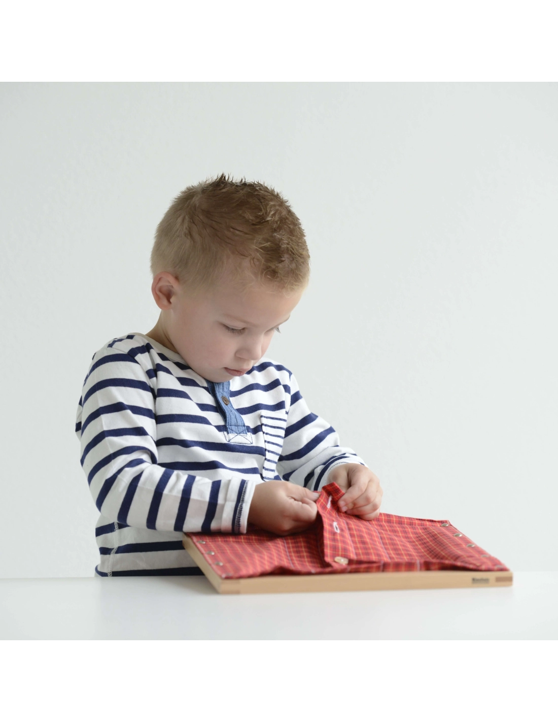 Le cadre d'habillage Montessori pour les pressions aide les enfants à développer leur autonomie, leur motricité fine et leur coordination œil-main en apprenant à manipuler des pressions de manière indépendante.