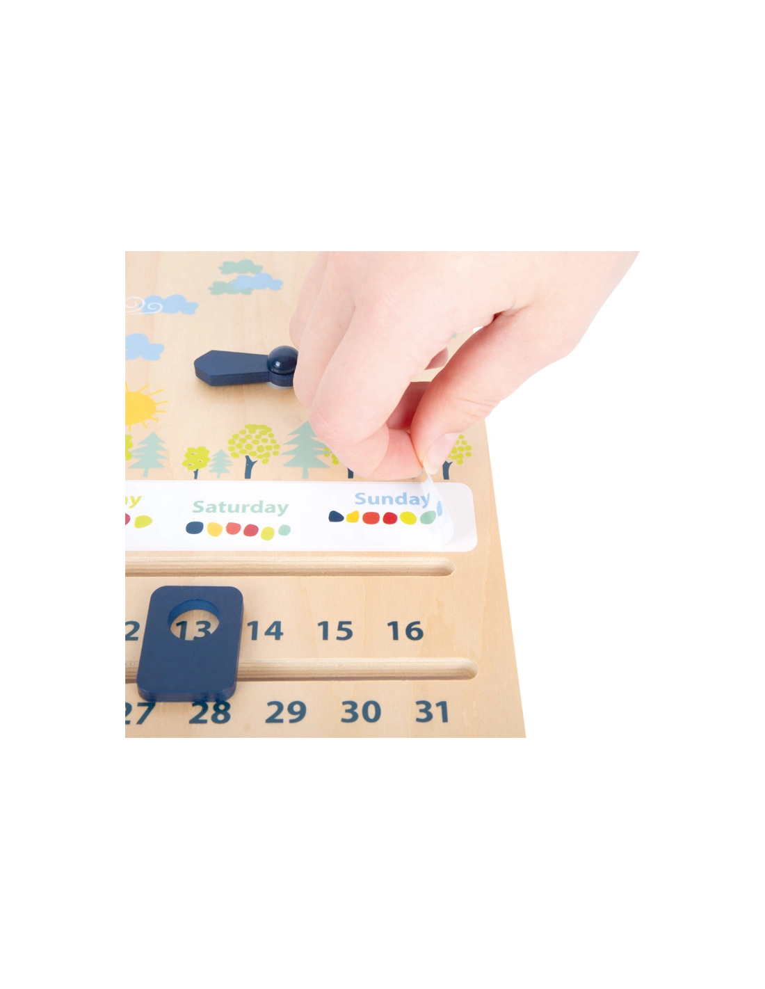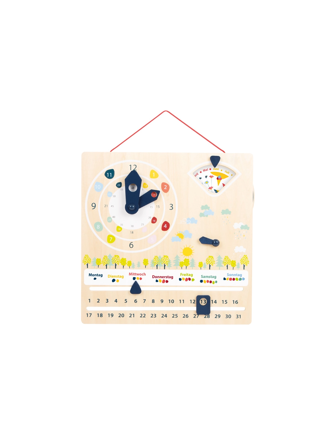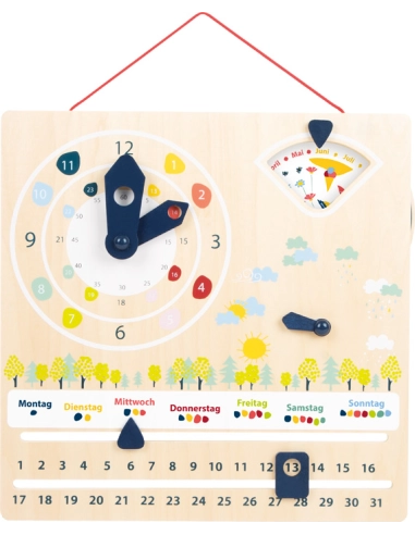 Affichage de l'heure en format 12 ou 24 heures. Apprendre le temps et les saisons et leur interdépendance. Peut être utilisé pour l'enseignement de langues. Apprendre les jours de la semaine et les dates. Forme la motricité fine grâce à la mobilité des aiguilles, roues et éléments.