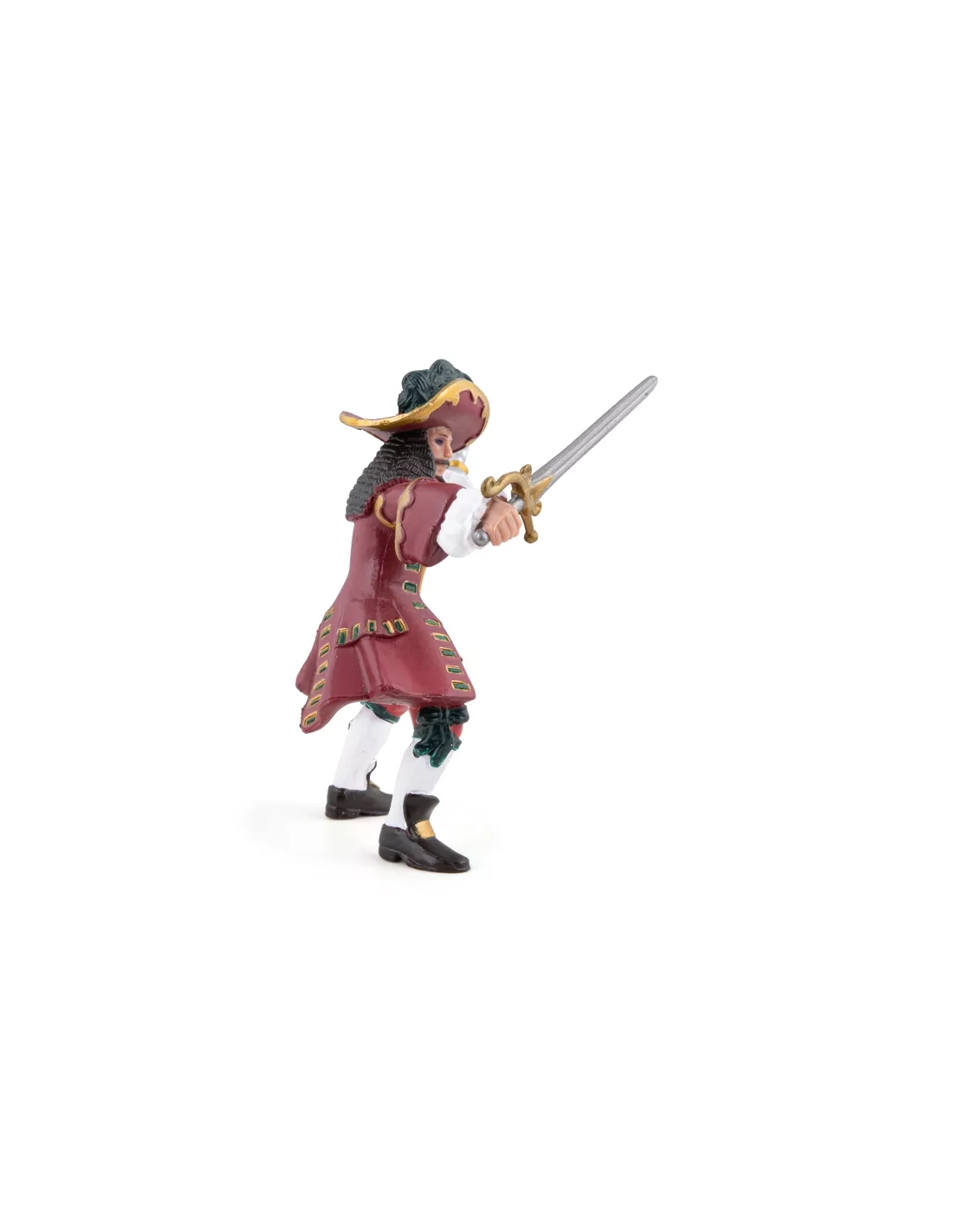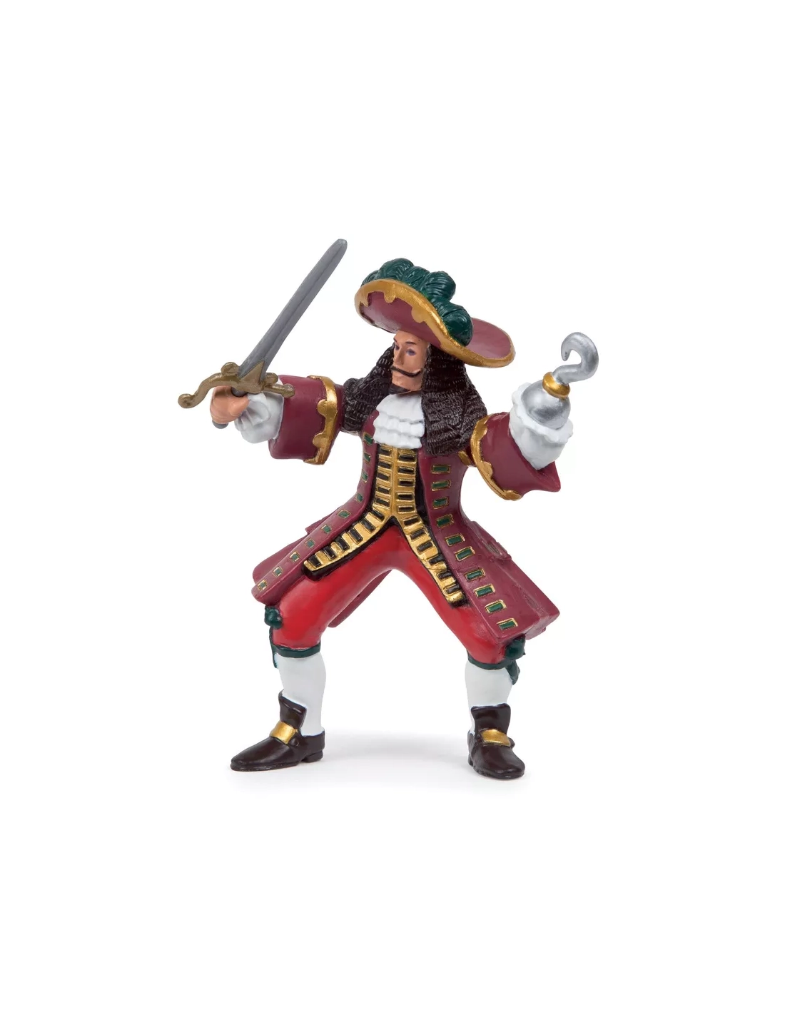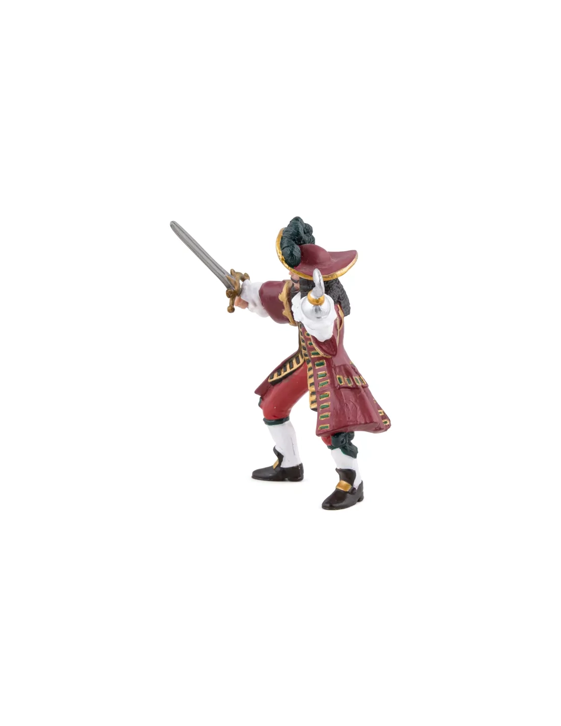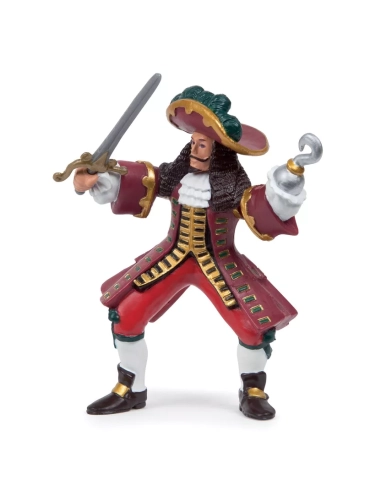 Grand chapeau à plumes bleues, longue veste rouge ornée, bottes noires, ceinture chargée. Sabre dans la main droite, crochet métallique à la main gauche. Jambes légèrement écartées, le port d'un homme qui n'a jamais demandé la permission à personne. Ce Capitaine Pirate Papo est le chef naturel de toute la collection Les Pirates et Corsaires : la figurine autour de laquelle tout l'équipage s'organise, celle qui donne les ordres et les tactiques. Peinte à la main, 8,8 cm de haut, boucanier du XVIIe siècle dans chaque détail.