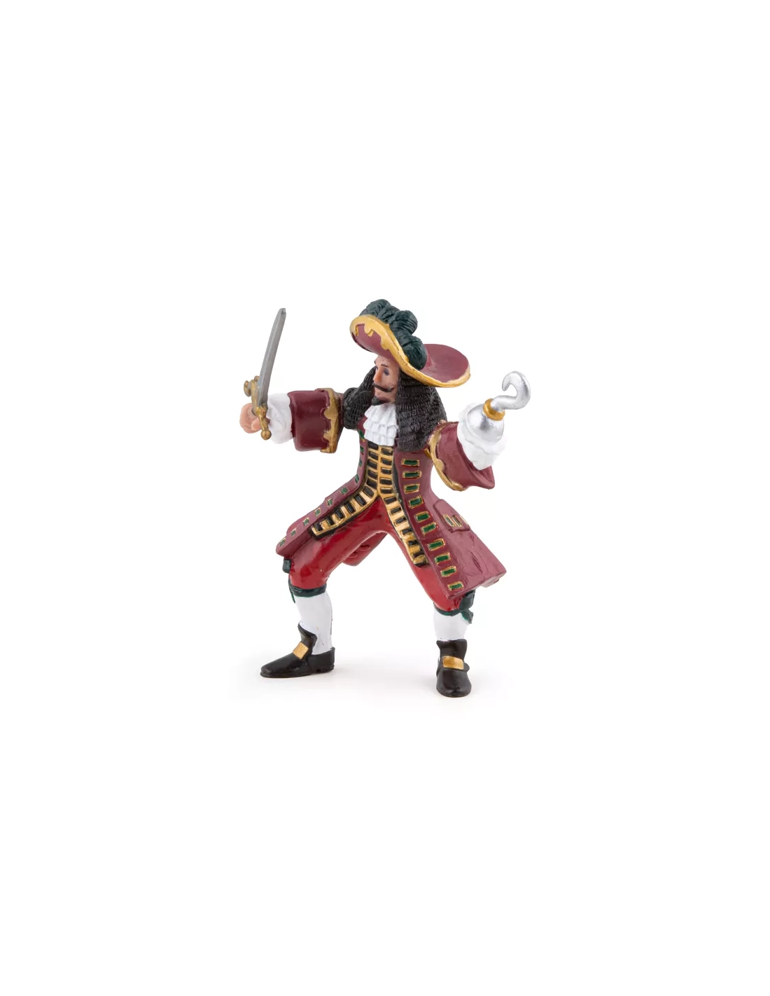 La figurine de référence de la collection Pirates et Corsaires : celle qu'on achète en premier, ou qu'on offre avec un premier équipage. Son crochet et son chapeau à plumes le rendent reconnaissable depuis n'importe quel angle de mise en scène.