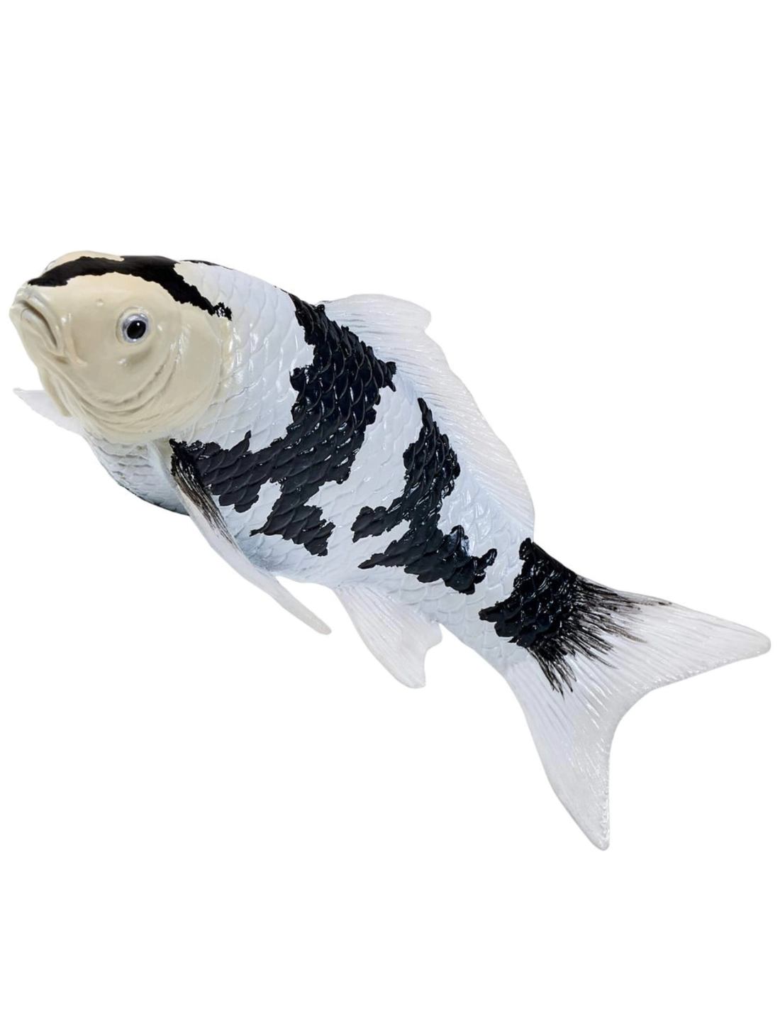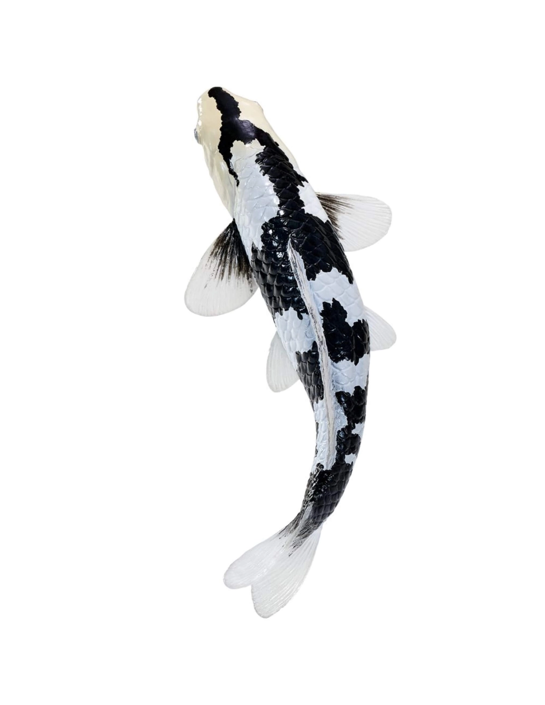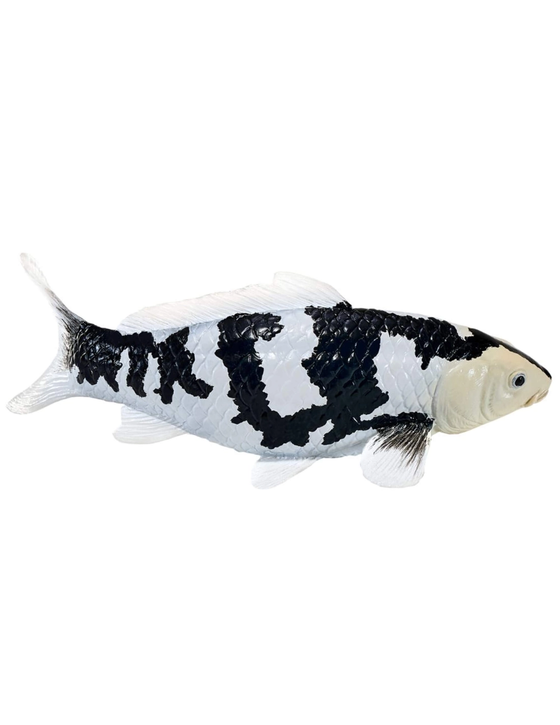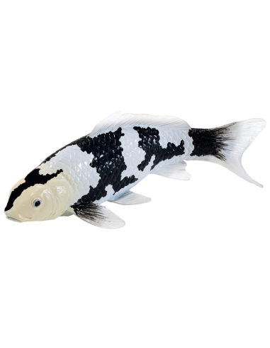La Shiro Utsuri, membre respecté de la famille des Utsuri, se distingue par ses motifs noirs profonds sur une base blanche immaculée. Cette figurine reproduit fidèlement cette dualité caractéristique qui fait la renommée de cette variété dans le monde des Koï.