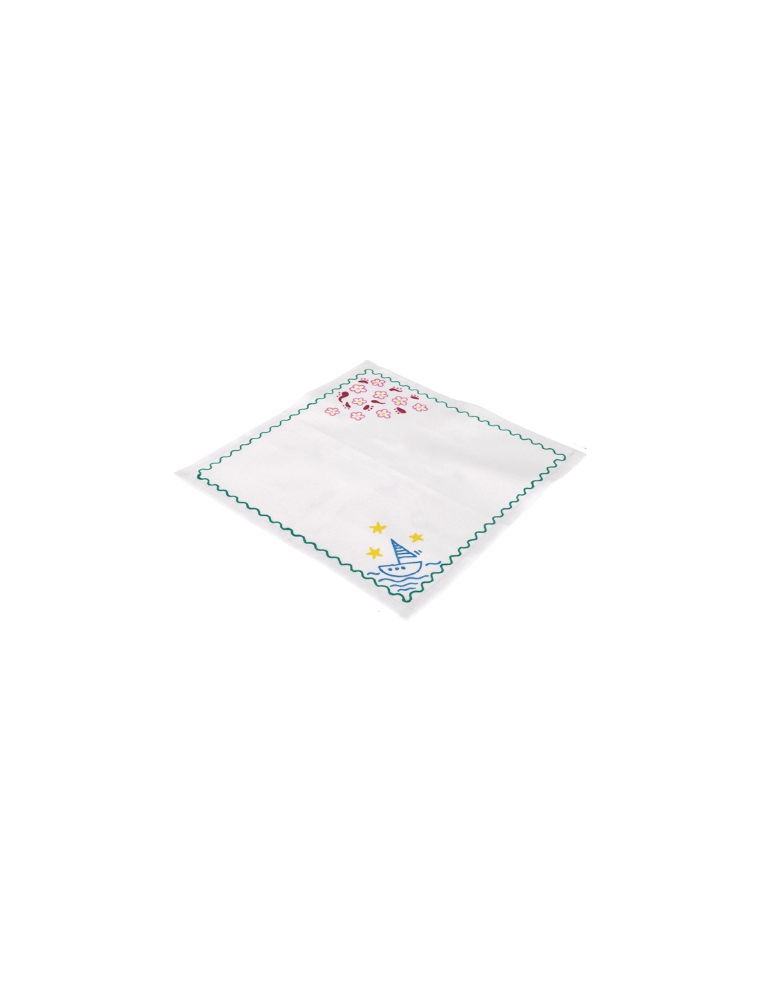 Un carré de coton aux bords surjetés, vierge et prêt. Sa petite taille en fait le support de broderie le plus accessible pour les jeunes enfants : un tambour de 15 cm couvre l'essentiel de la surface, un motif simple — un cœur, une étoile, une fleur — tient entier dans l'espace. On brode, on peint, on tamponne. Et à la fin, il y a quelque chose de réel : un mouchoir étoffe personnalisé, une serviette de table de saison, un cadeau fait main qui s'utilise au quotidien.