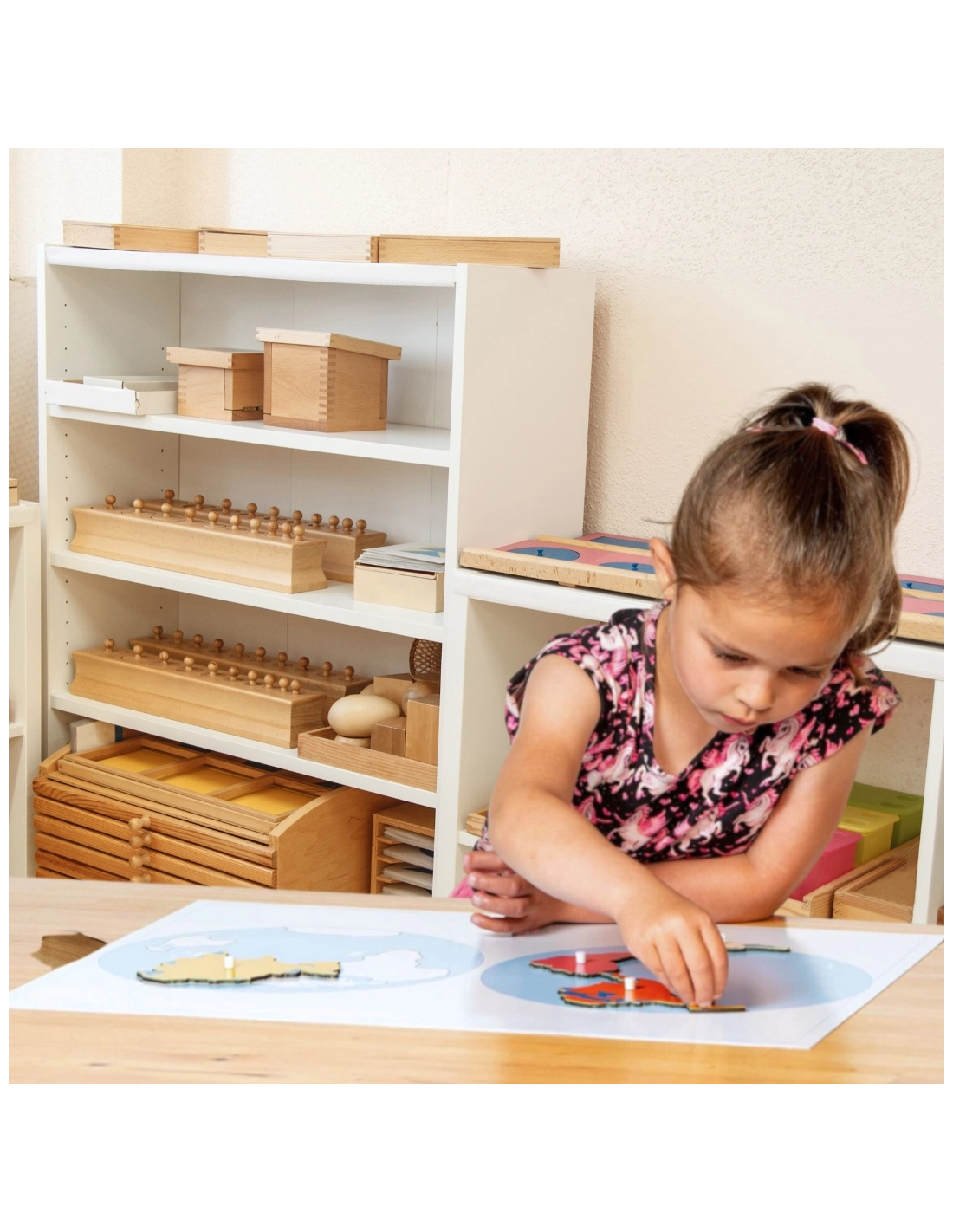 - Dimensions: Identiques au planisphère Montessori, permettant une correspondance parfaite entre le puzzle et la carte.
