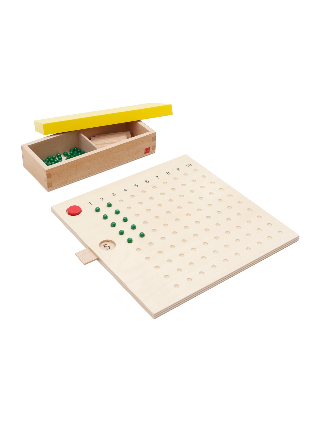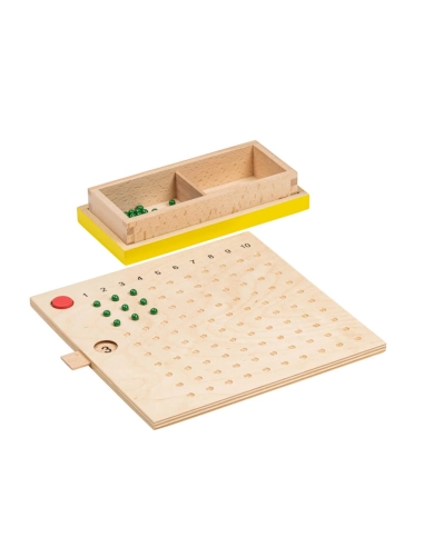 Pour utiliser le Tableau de multiplication Montessori, l'enfant place une perle verte dans chaque case du tableau. Il place ensuite l'étiquette numéro 1 dans la fenêtre sur le côté gauche du tableau. L'enfant doit ensuite compter les perles vertes dans la rangée du haut et placer le jeton rouge sur le chiffre correspondant dans la colonne de gauche. Il répète ensuite cette opération pour les étiquettes numérotées de 2 à 10.