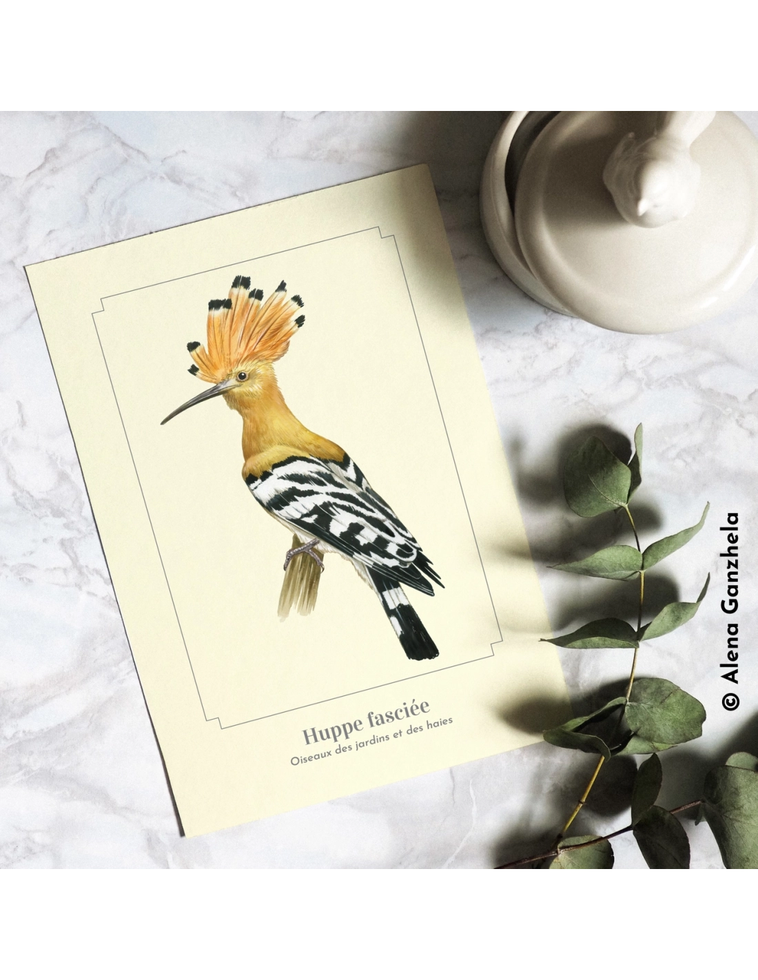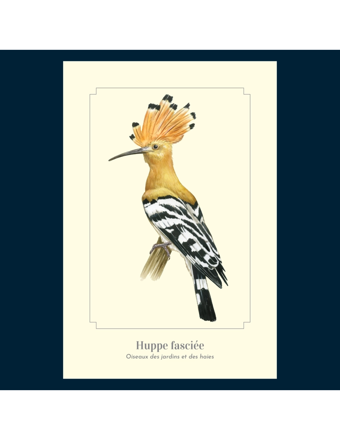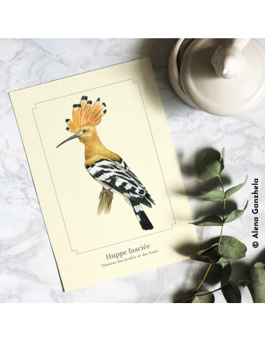 La Huppe fasciée (Upupa epops) — reconnaissable à sa huppe érectile orange bordée de noir — fréquente vergers et prairies sèches où elle sonde le sol de son long bec courbé. Cette carte, au fond crème discret, met en valeur chaque détail sans distraire l’œil, fidèle à l’esprit Montessori.