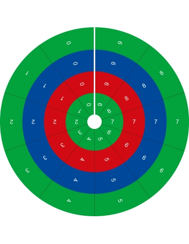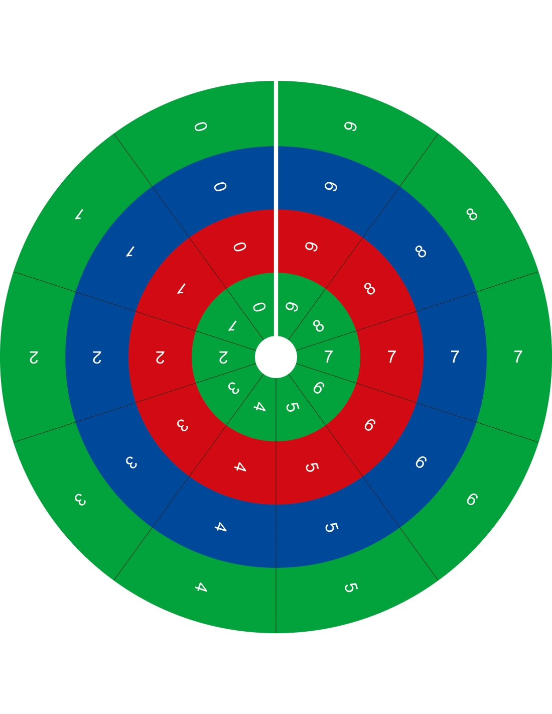 Le Cercle des Opérations rend visible le système décimal par le mouvement. Chaque cercle concentrique représente une valeur de position : unités, dizaines, centaines et milliers, identifiées par des couleurs distinctes.