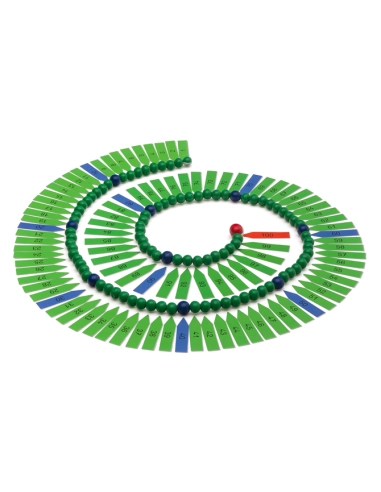 La Chaîne de 100 avec Flèches Numériques est utilisée dans les classes Montessori pour enseigner les concepts de numération, de séquence et de valeurs de position. En manipulant cette chaîne de perles, les enfants apprennent à compter jusqu'à 100 et à comprendre les différentes valeurs de position des nombres de manière concrète.