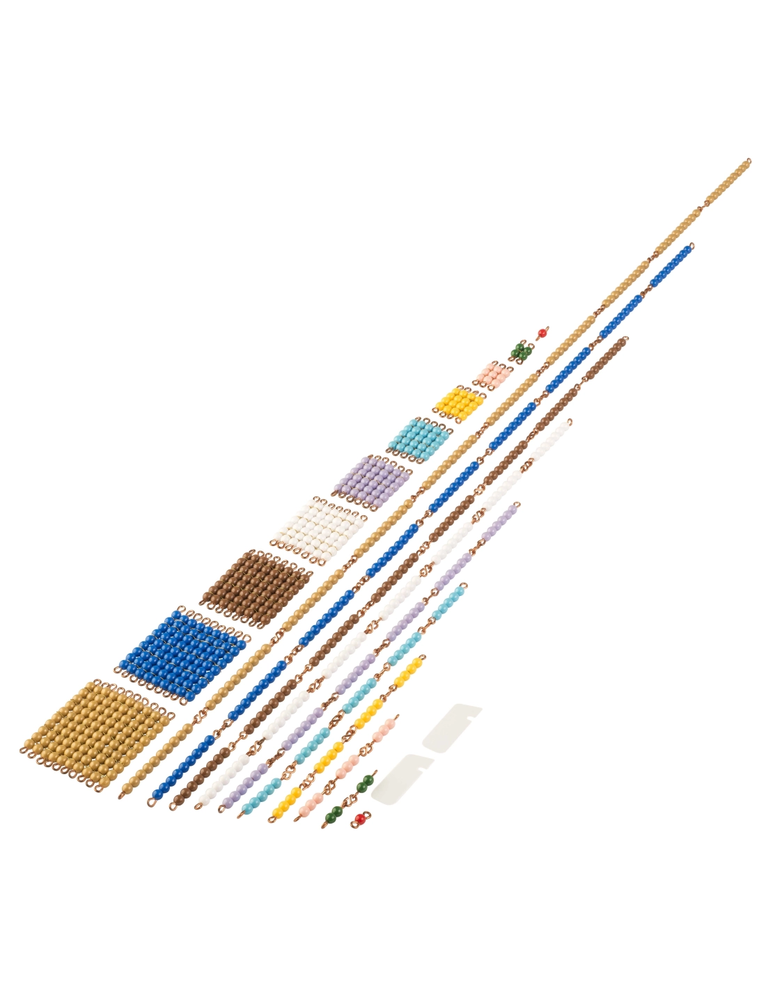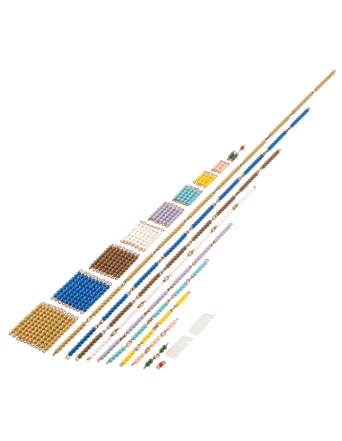 Découvrez la Chaîne de 100 Perles Dorées, un matériel éducatif essentiel pour l'apprentissage des concepts de numération selon la méthode Montessori. Cet outil aide les enfants à comprendre et à visualiser les nombres de 1 à 100 de manière linéaire et concrète.