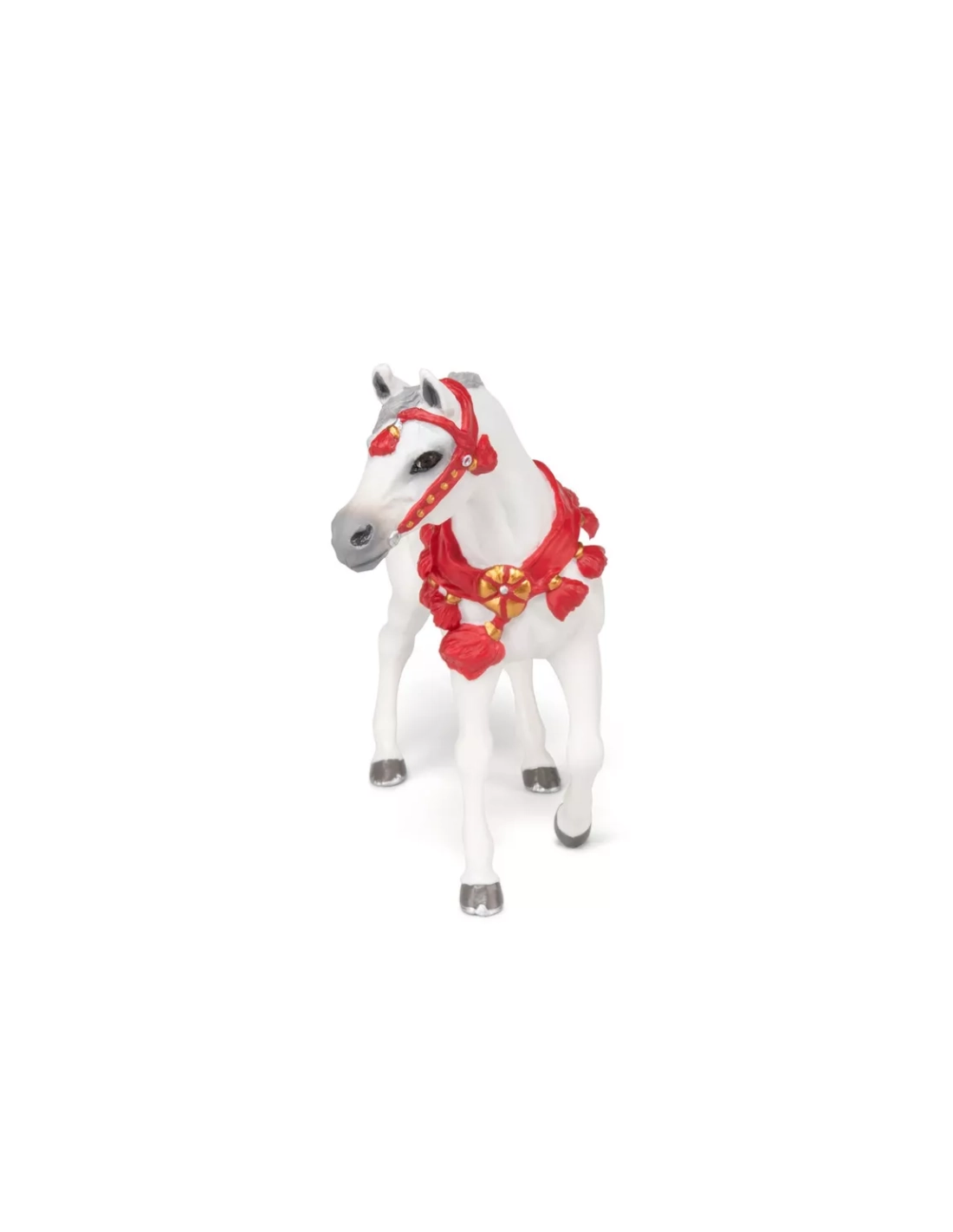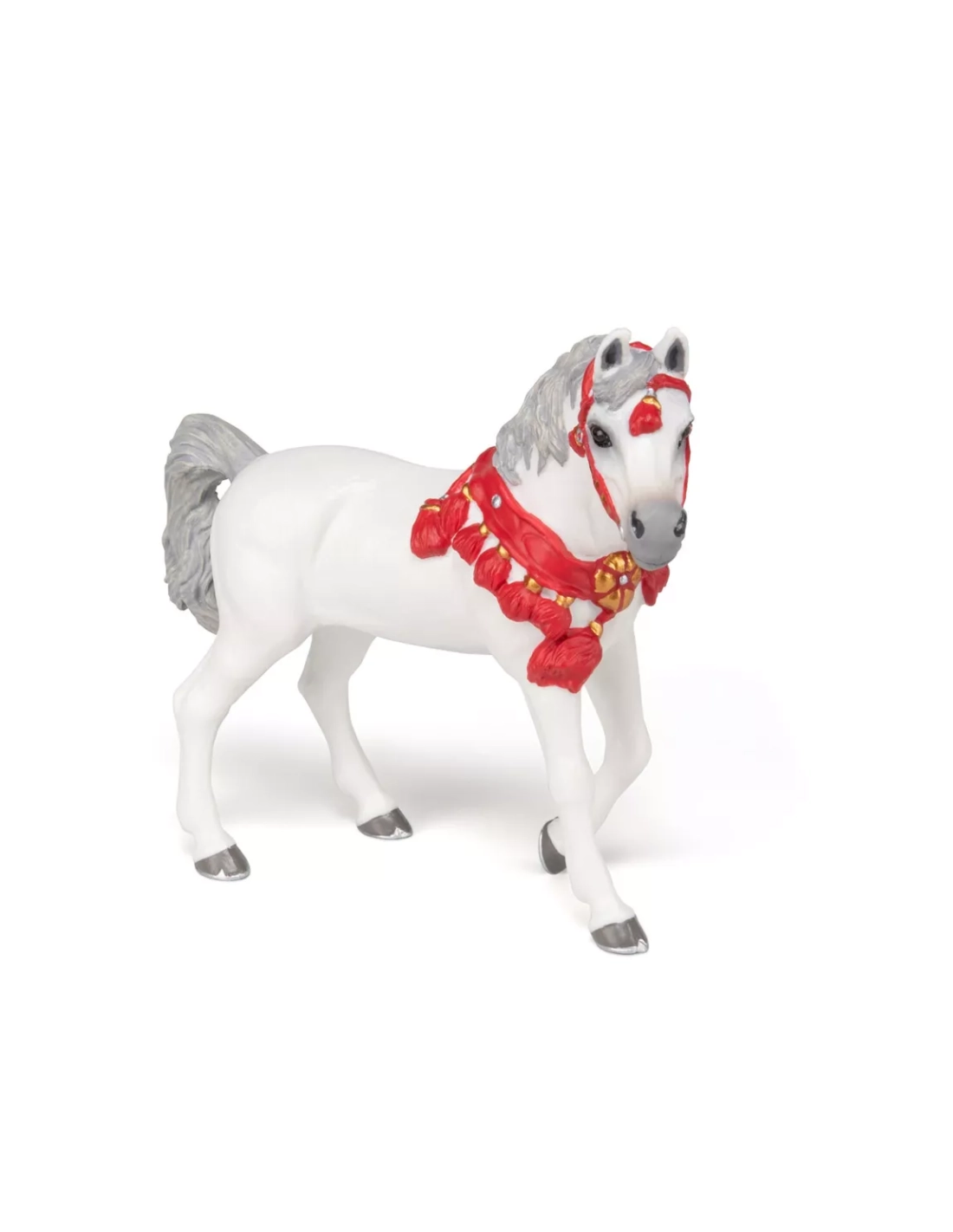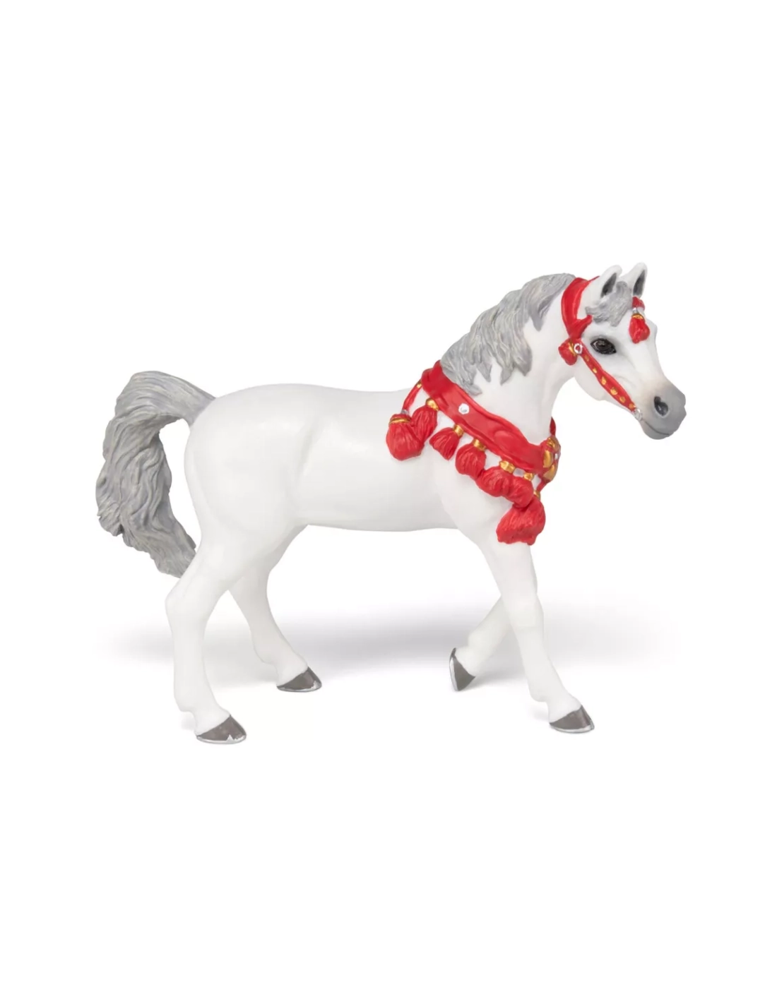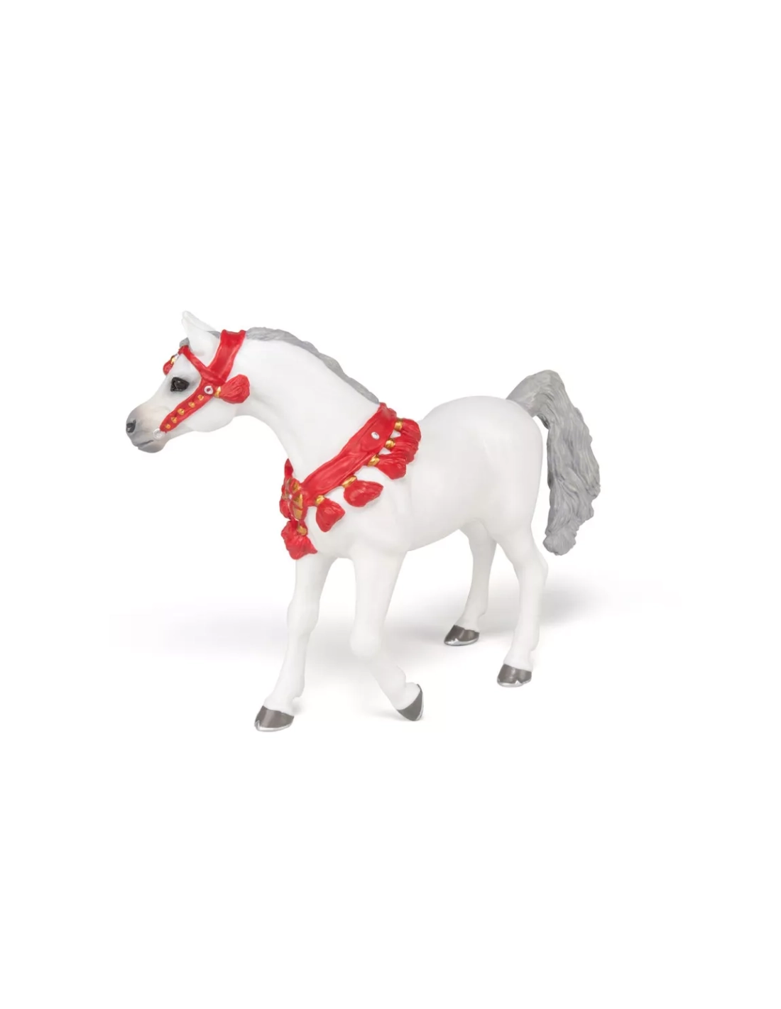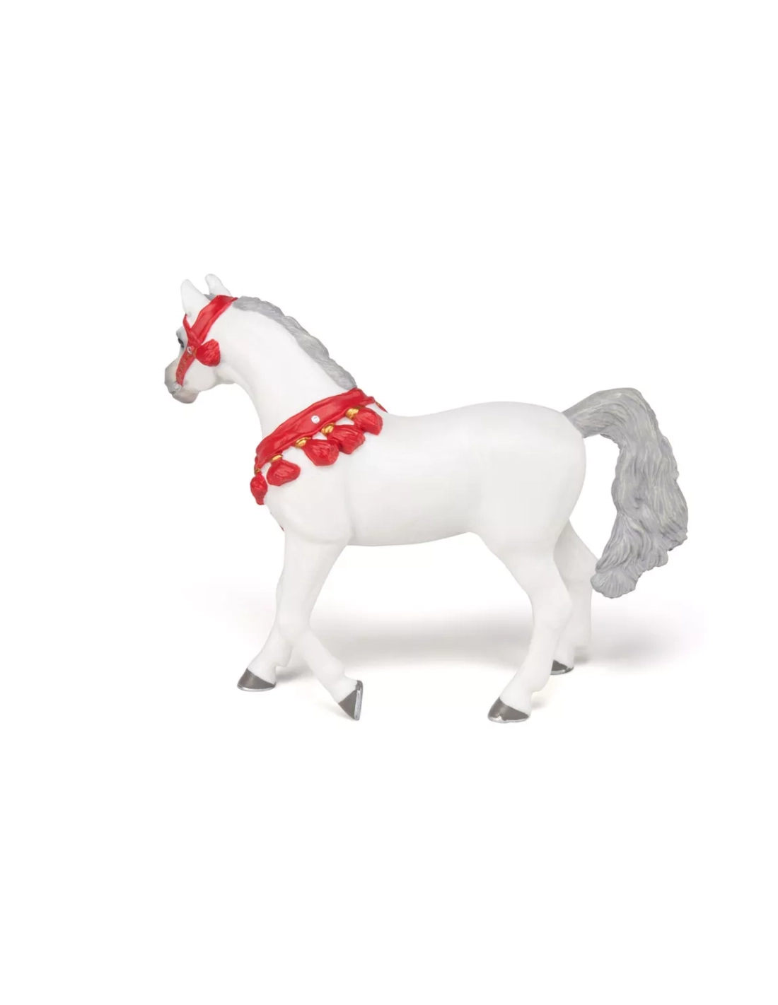 Découvrez la figurine Cheval Arabe blanc en tenue de parade Papo référence 51568, représentation magnifique d'un pur-sang arabe paré pour les concours de beauté. Ce modèle porte un harnachement décoratif richement orné, peint avec des finitions dorées.