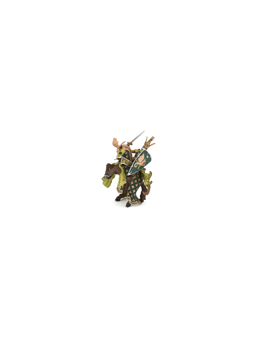 Le Cheval du Maître des armes cimier dragon (39923) est conçu pour accueillir la figurine du Maître des armes cimier dragon (39922). Les deux sont vendus séparément mais leurs armures, emblèmes et palettes de couleurs sont coordonnés pour former un binôme visuellement cohérent. Ensemble, ils constituent le chevalier monté le plus imposant de la collection Médiéval Fantastique Papo.