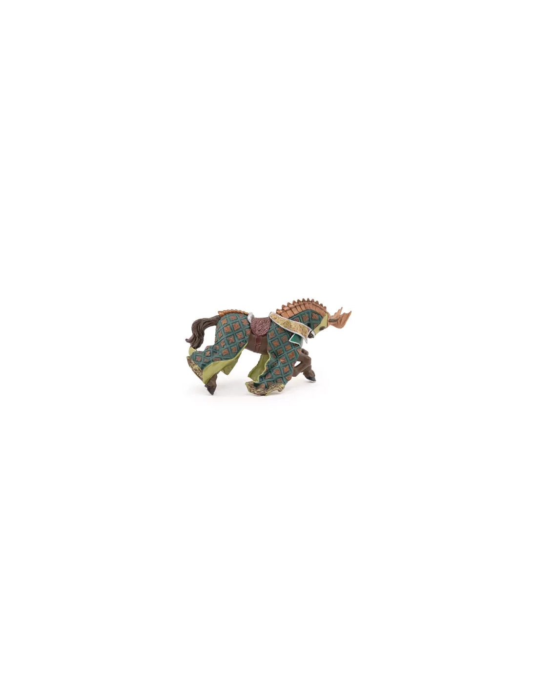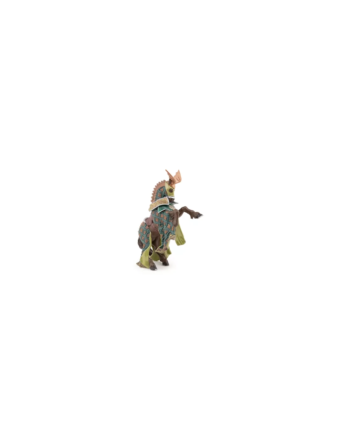 Destrier de guerre Papo en caparaçon aux couleurs du dragon, chanfrein surmonté d'ailes de dragon sculptées et bouclier dragon sur le poitrail. Peint à la main. 16 x 6 x 8 cm. Cavalier assorti : Maître des armes cimier dragon réf. 39922. Dès 3 ans.
