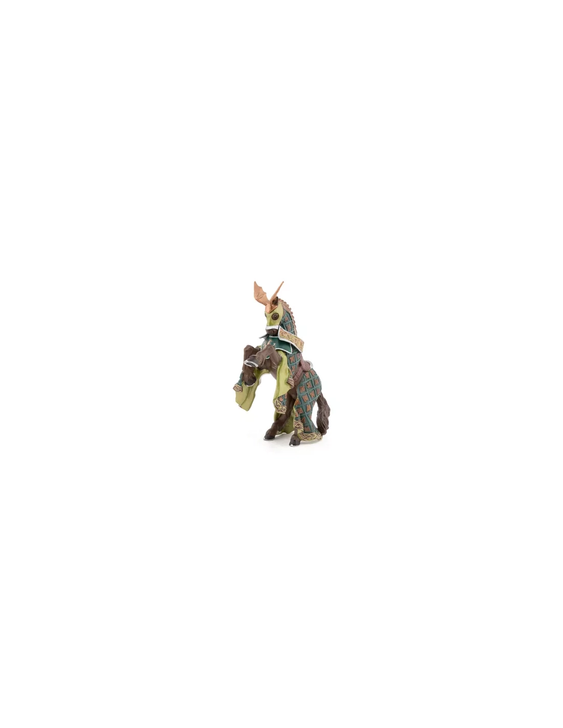 À partir du XIIIe siècle, à mesure que les armes à portée (arbalètes, arcs longs) devenaient plus meurtrières, les chevaliers commencèrent à équiper leurs chevaux d'armures de protection. Le barding — l'ensemble des protections équines — comprenait le chanfrein (protection de la tête), le crinet (protection de l'encolure), le peytral ou plastron (protection du poitrail) et le crupper (protection de la croupe). Un cheval en barding complet était littéralement aussi bien protégé qu'un chevalier à pied. Le Cheval du Maître des armes cimier dragon Papo reproduit fidèlement ce système — avec en plus les emblèmes du dragon qui identifient le tandem à distance.