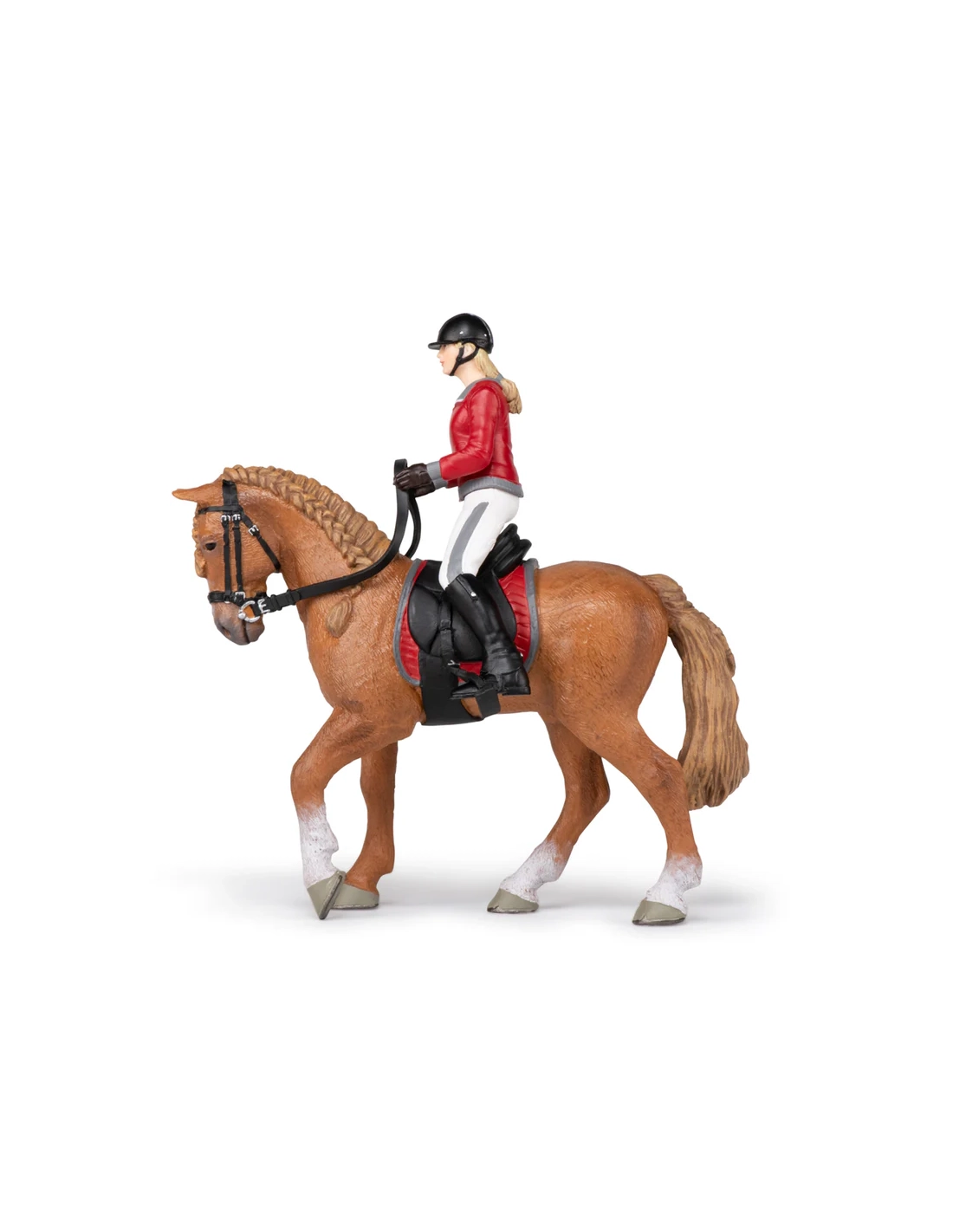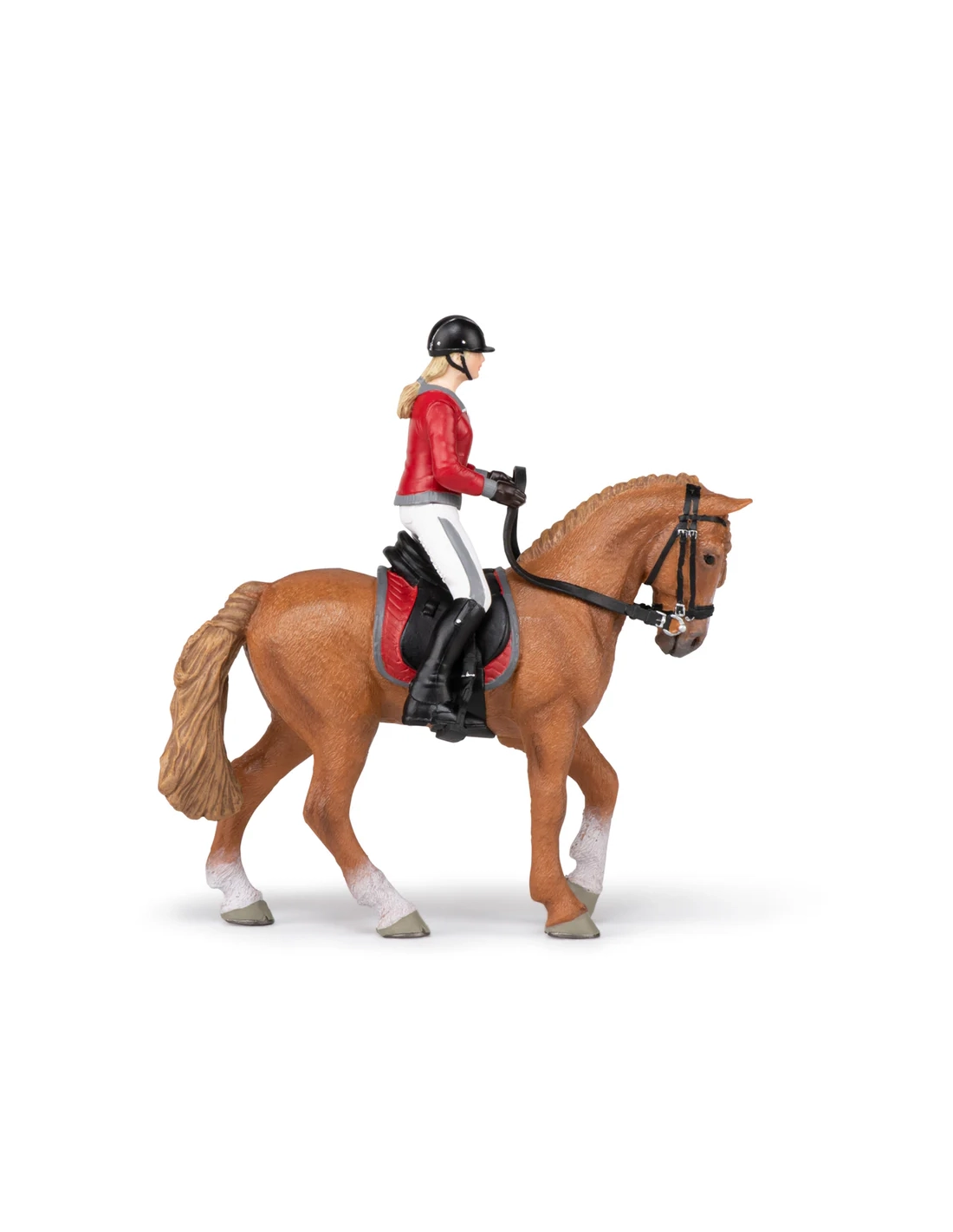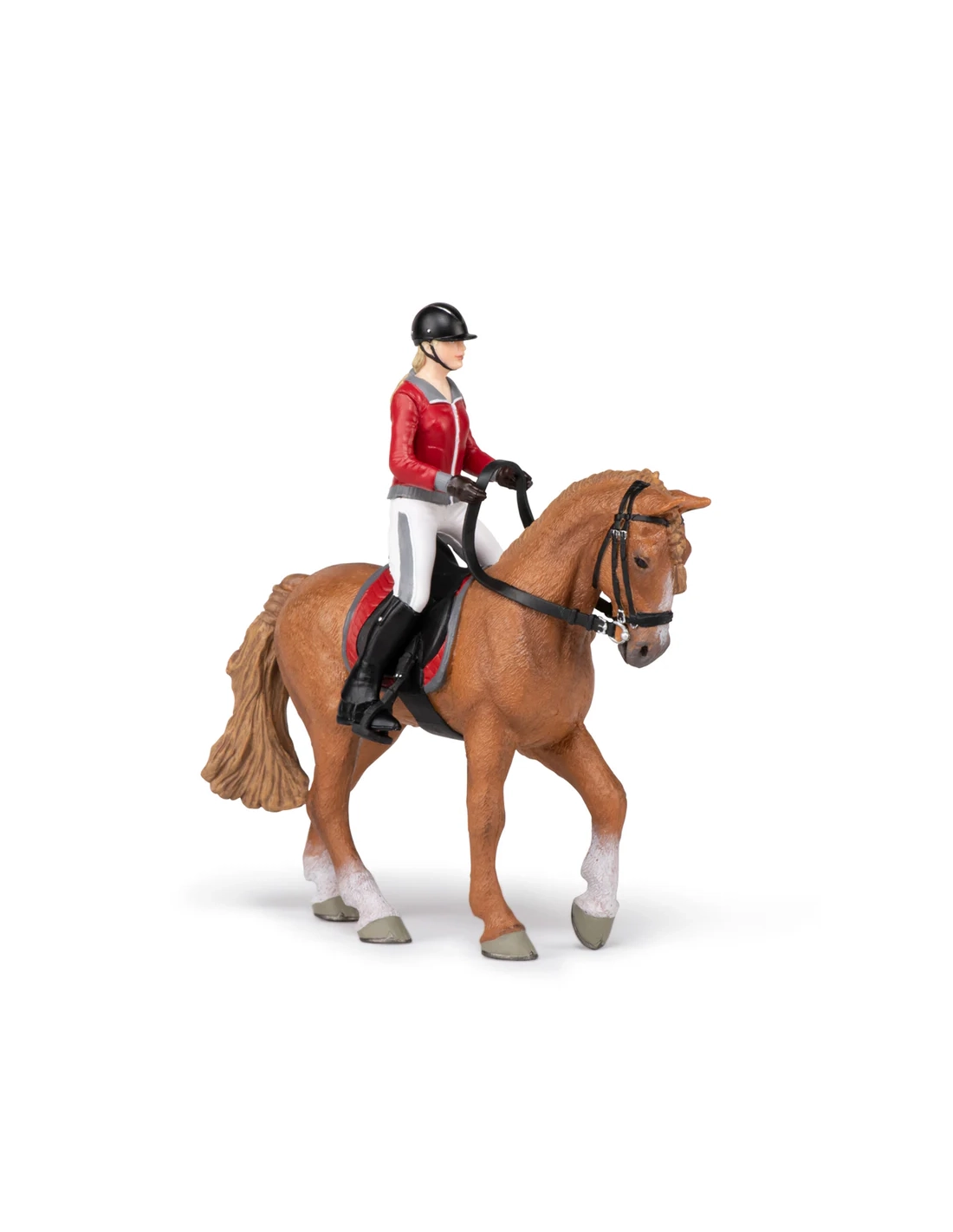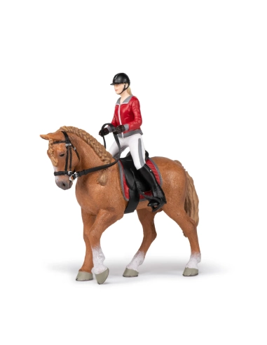 Cette figurine Papo représente une cavalière en tenue d’équitation guidant calmement son cheval de promenade. L’ensemble évoque une sortie en extérieur, un moment de loisir où cheval et cavalière avancent d’un pas régulier, dans une relation de confiance et de douceur.