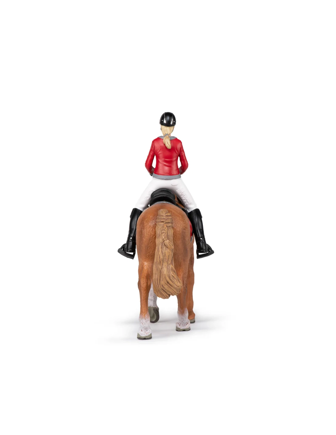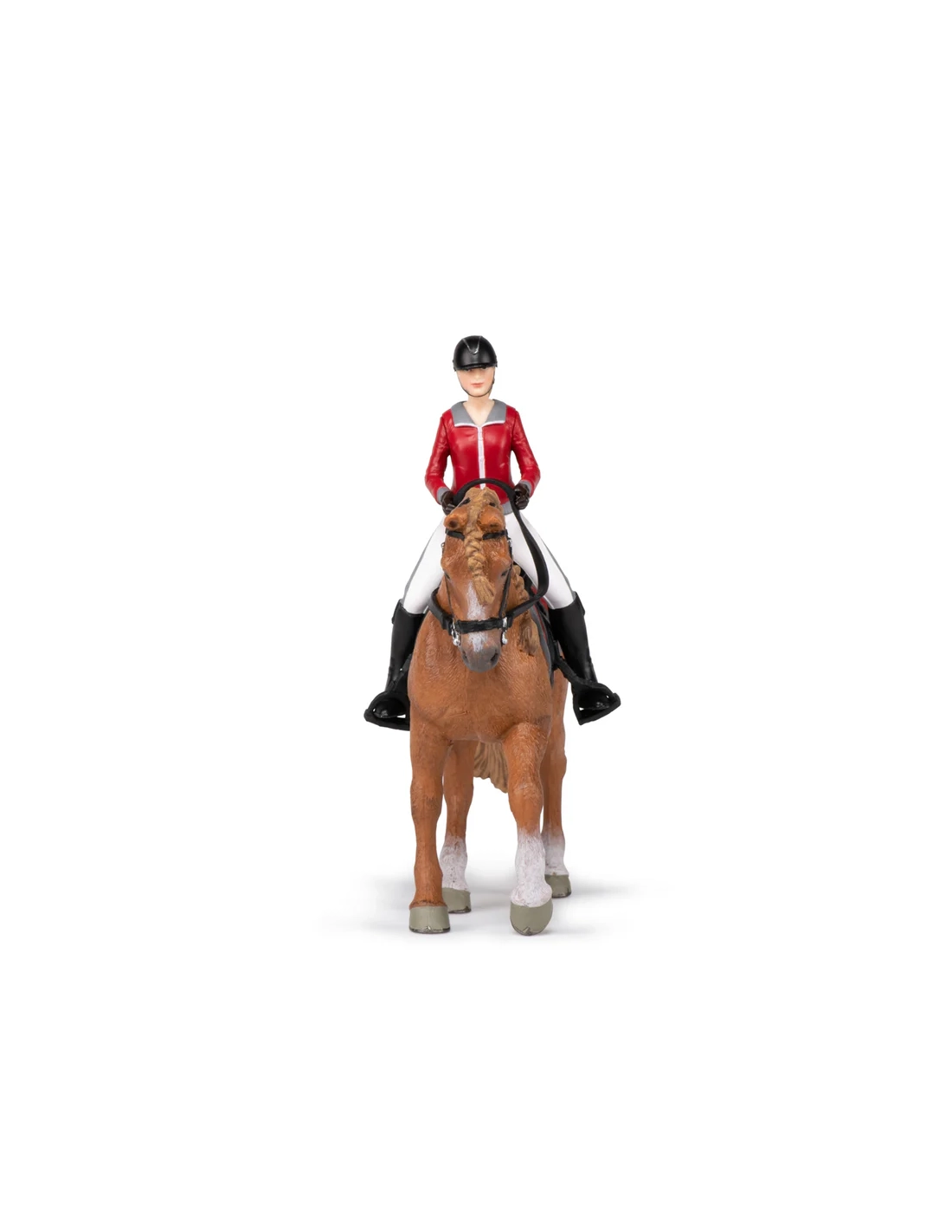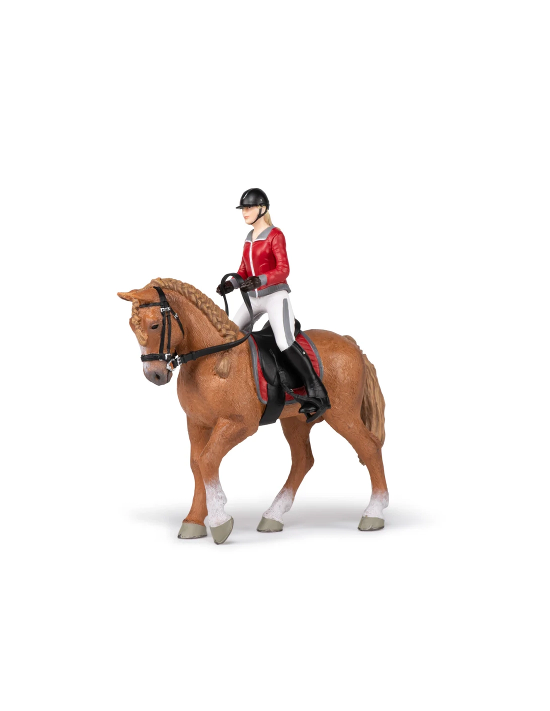 Cette figurine Papo représente une cavalière en tenue d’équitation guidant calmement son cheval de promenade. L’ensemble évoque une sortie en extérieur, un moment de loisir où cheval et cavalière avancent d’un pas régulier, dans une relation de confiance et de douceur.