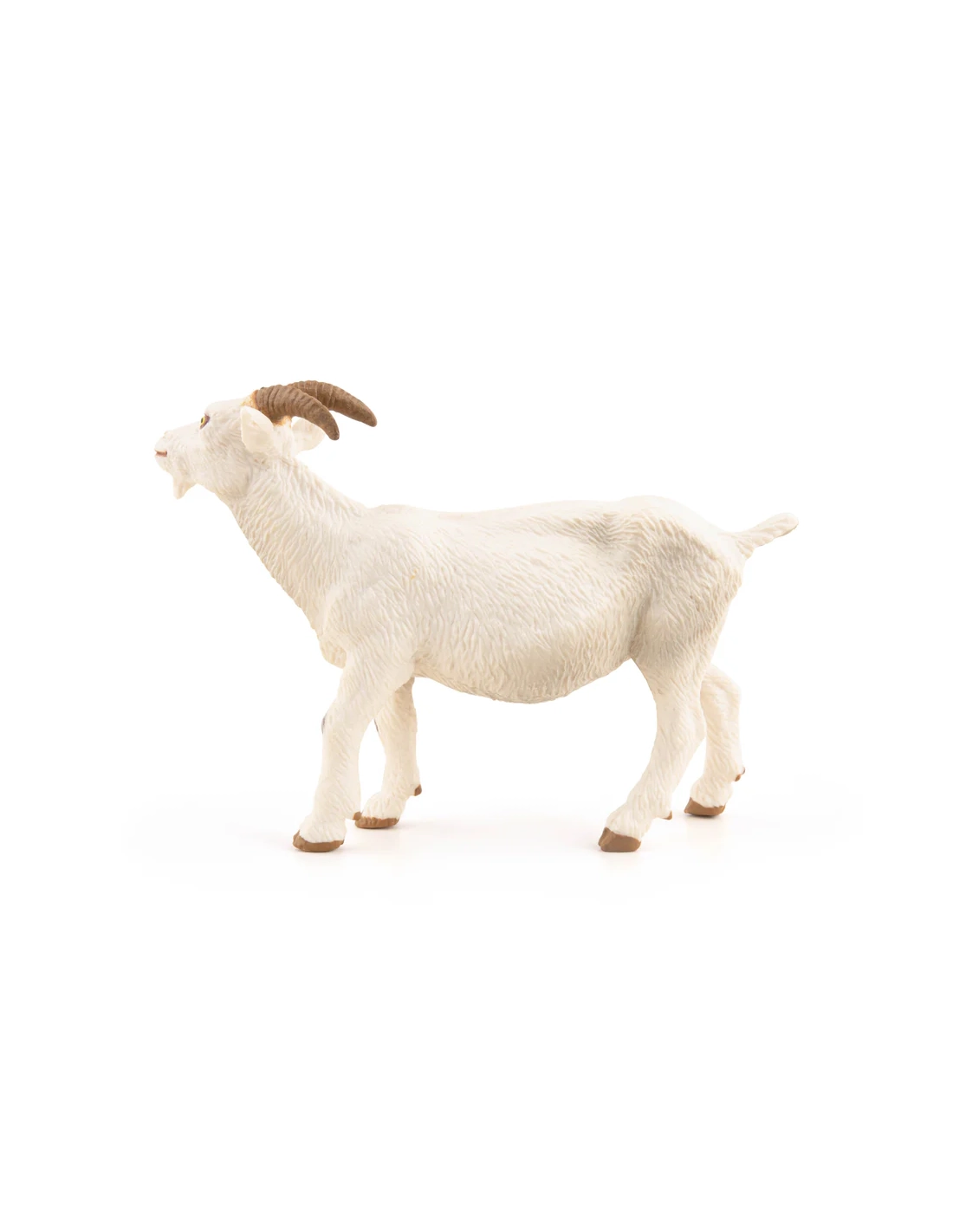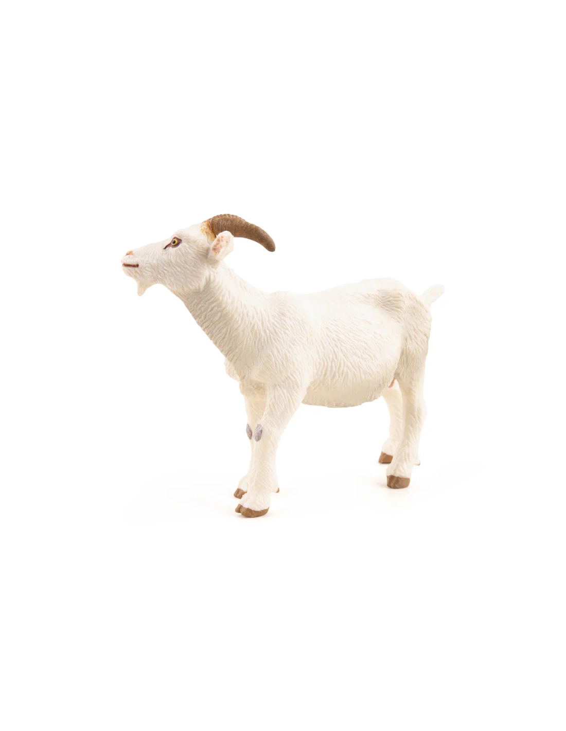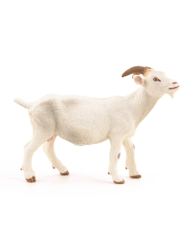 Robe d'un blanc pur caractéristique, barbiche triangulaire bien dessinée, cornes recourbées en arrière et oreilles dressées — la figurine Chèvre blanche Papo restitue la race Saanen, originaire du canton suisse de Saanenland. ~9 × 2,5 × 6,5 cm, peinte à la main. La chèvre laitière de référence internationale, avec ses 900 à 1 100 litres de lait par an en moyenne — pour une collection de ferme ancrée dans la zootechnie réelle.