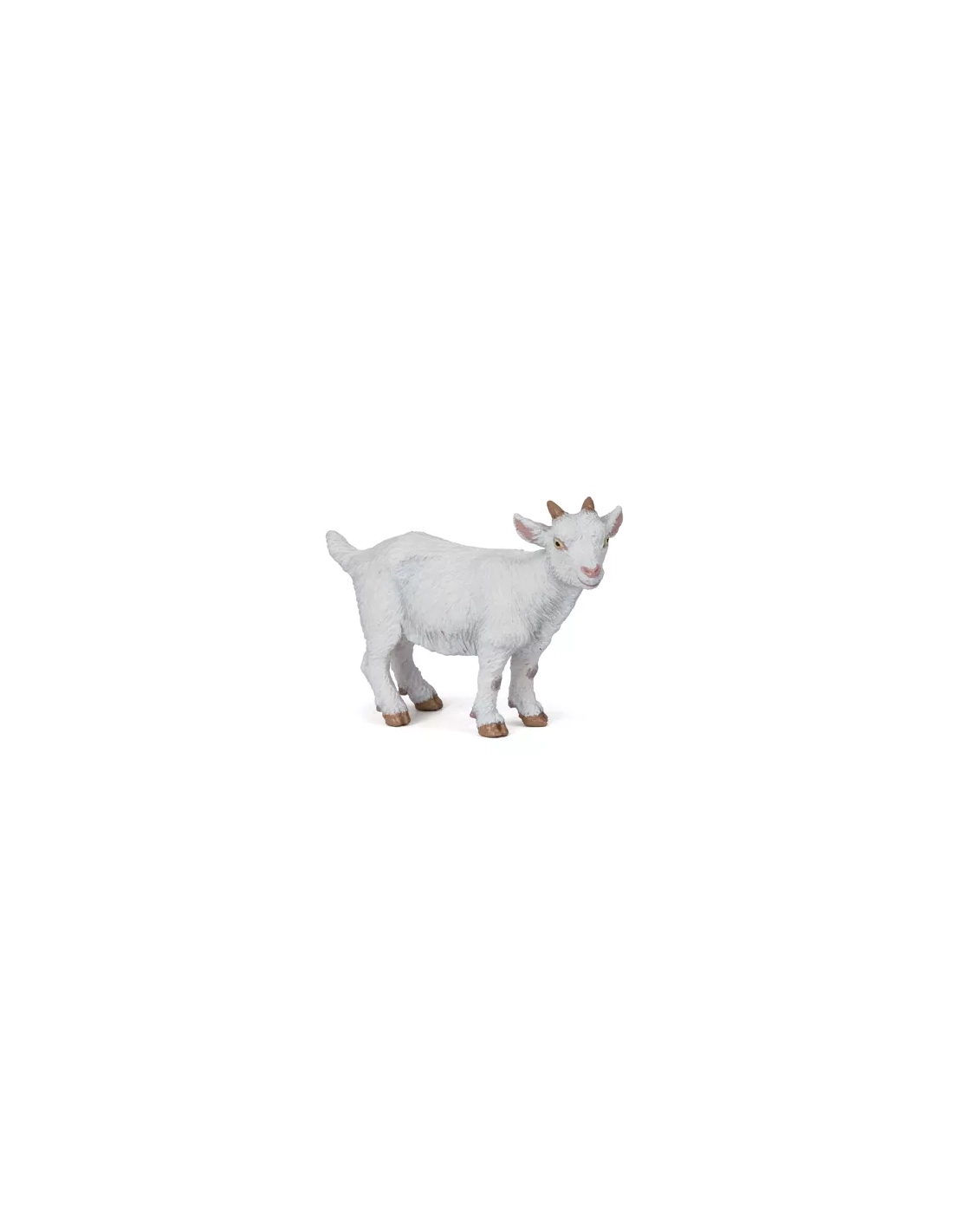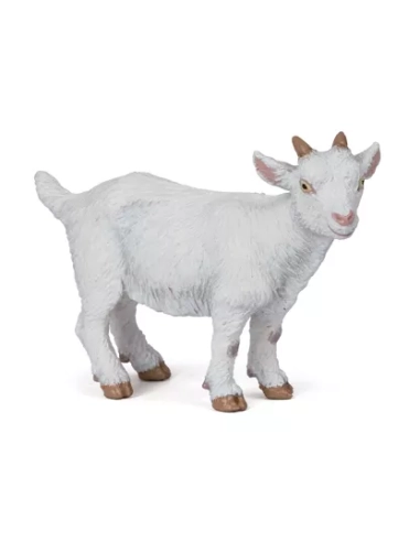 Silhouette miniature toute blanche, pattes fines encore chancelantes, oreilles dressées et regard vif — la figurine Chevreau blanc Papo capture le nouveau-né caprin dans sa première posture debout. Réf. 51146. ~7 × 2,5 × 4,5 cm. Peinte à la main. Le bébé de la chèvre Saanen, qui doit impérativement boire le colostrum dans les 6 premières heures sous peine de rester sans défenses immunitaires. La pièce tendresse indispensable de la famille caprine Papo. Collection La vie à la ferme.