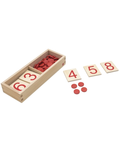 Les chiffres imprimés Montessori, certifiés AMI, sont conçus pour être utilisés avec les barres numériques afin d'aider les enfants à associer les quantités et les symboles de 1 à 10. Les chiffres sont imprimés en rouge sur des tablettes en bois.