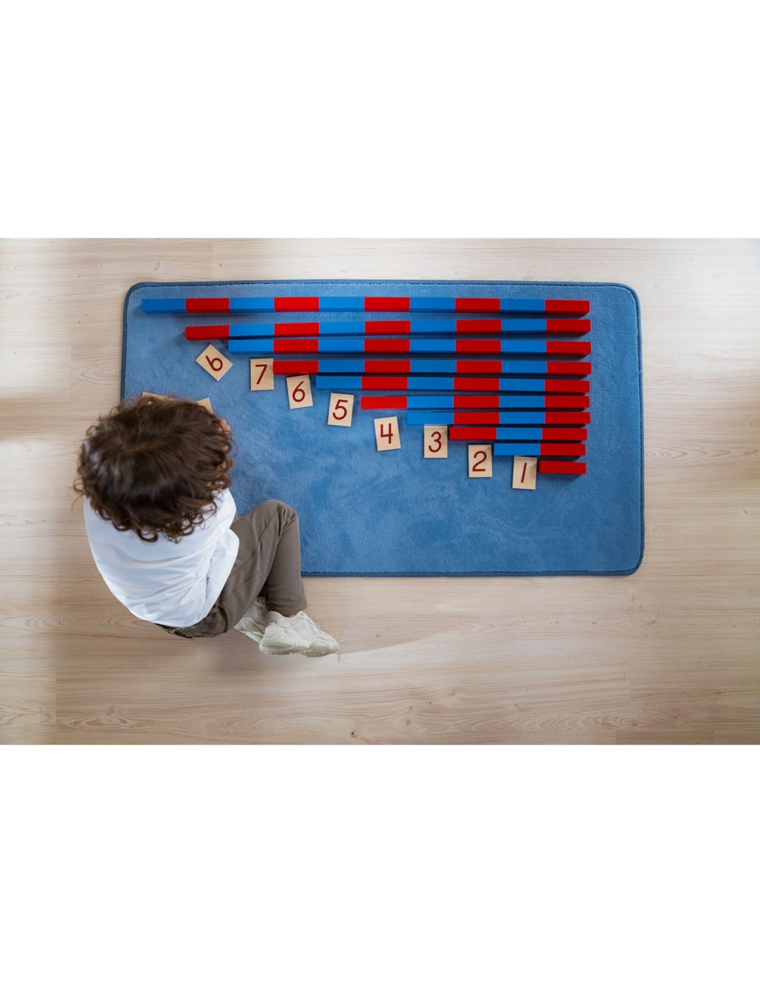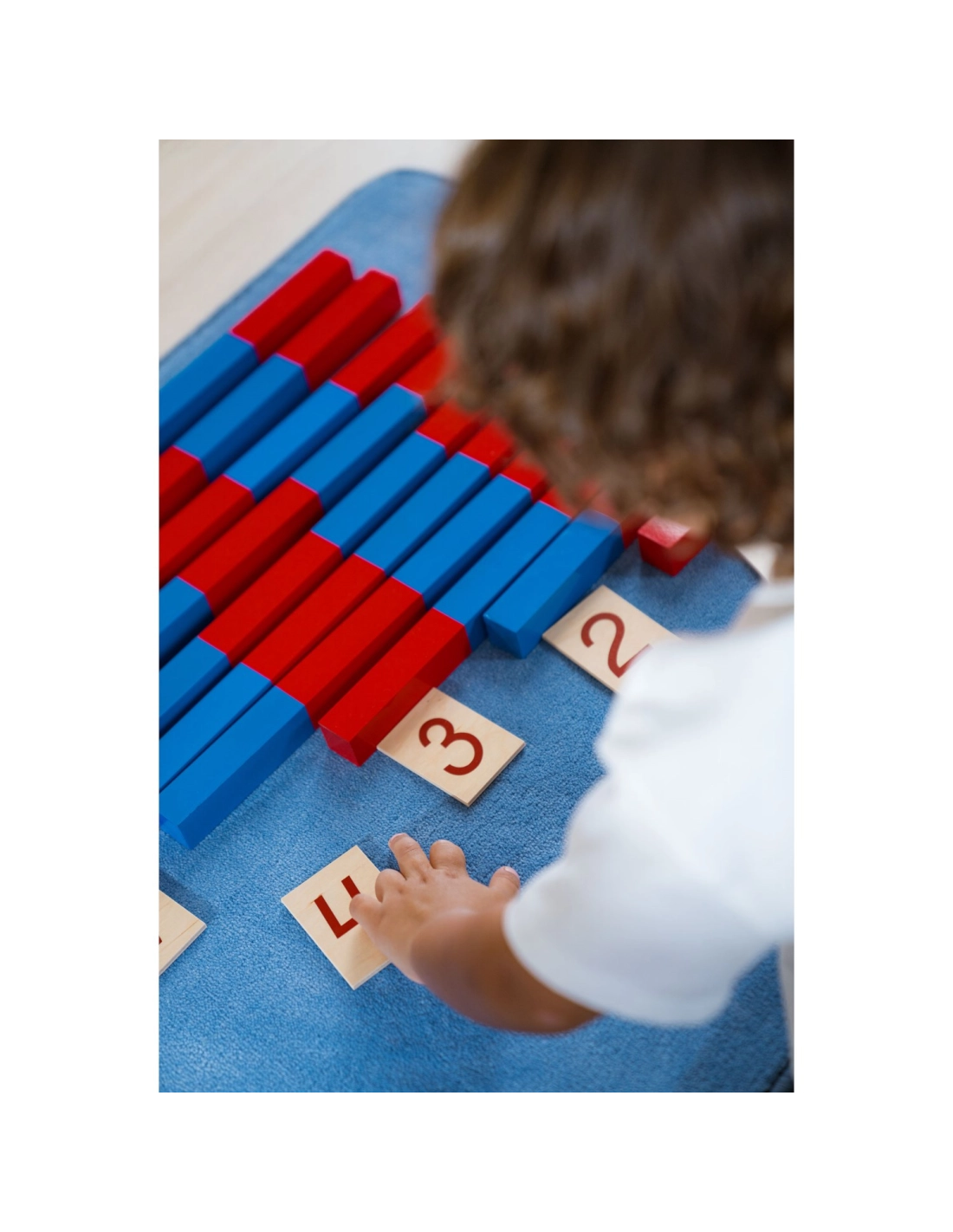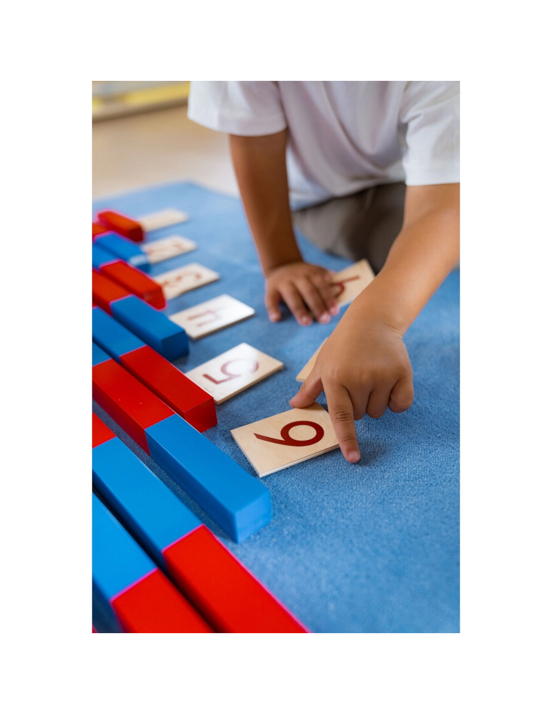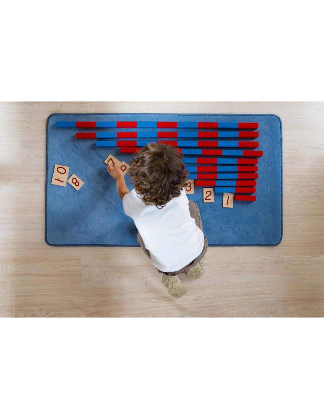 Le matériel de référence AMI pour la séquence de numération. S'intègre immédiatement dans une ambiance préparée avec les barres numériques pour compléter la présentation des nombres 1 à 10.