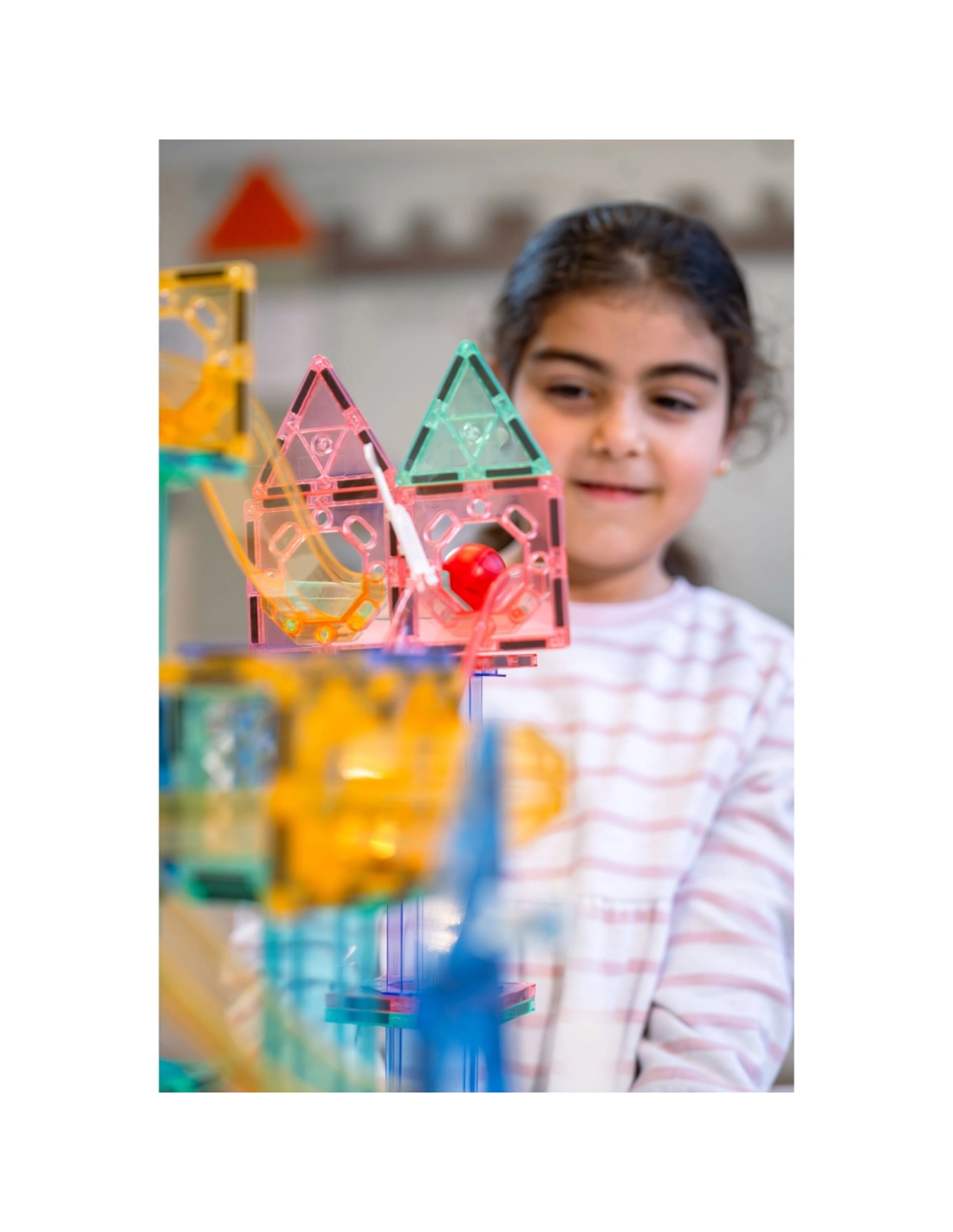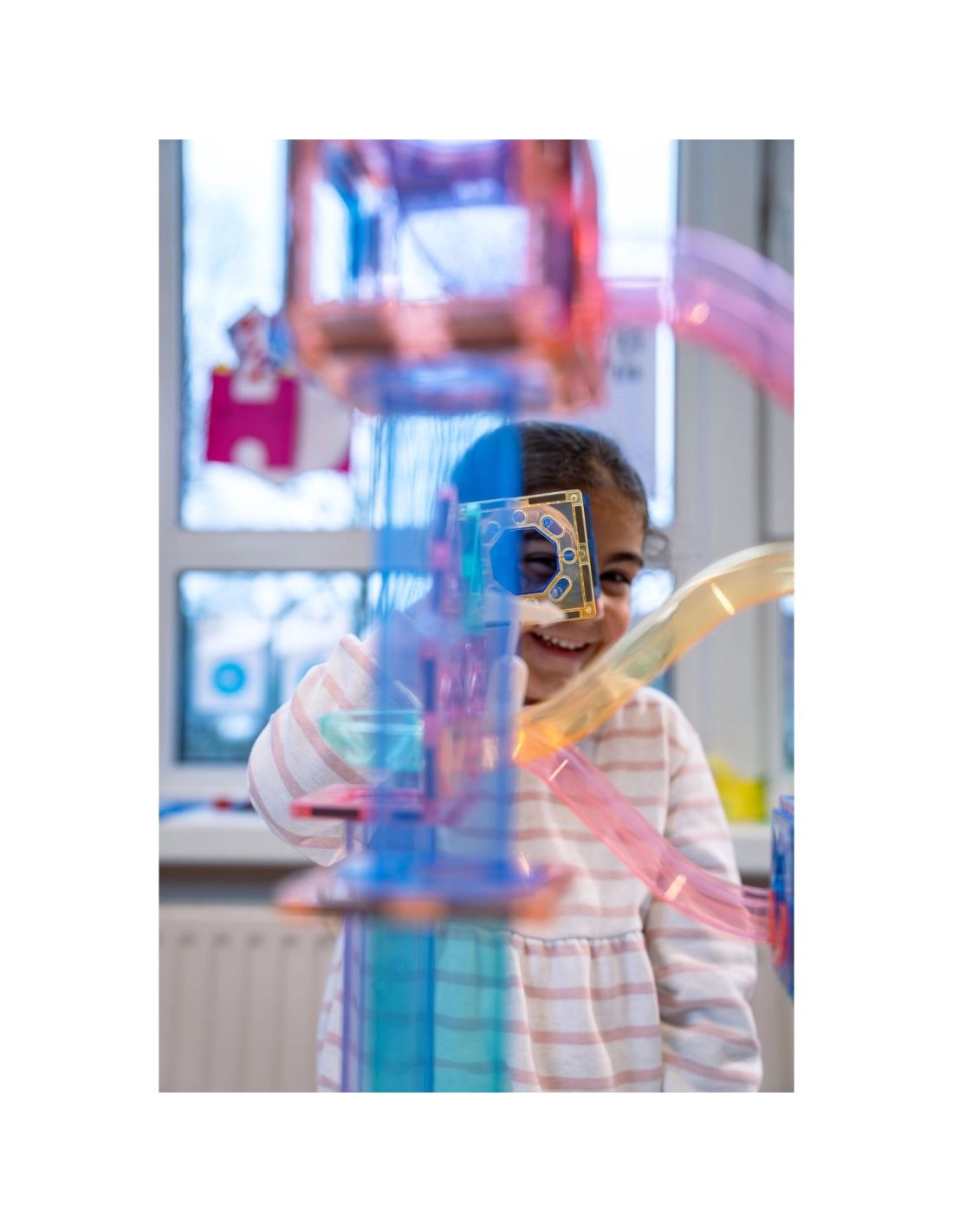 La construction d'un circuit Marble Run suit une logique d'ingénierie simple : chaque segment doit conduire naturellement au suivant. Une inclinaison insuffisante, et la bille s'arrête. Un virage trop serré, et elle déraille. Une hélice mal positionnée, et elle ne tourne pas. Chaque échec est une leçon, chaque succès une victoire collective.