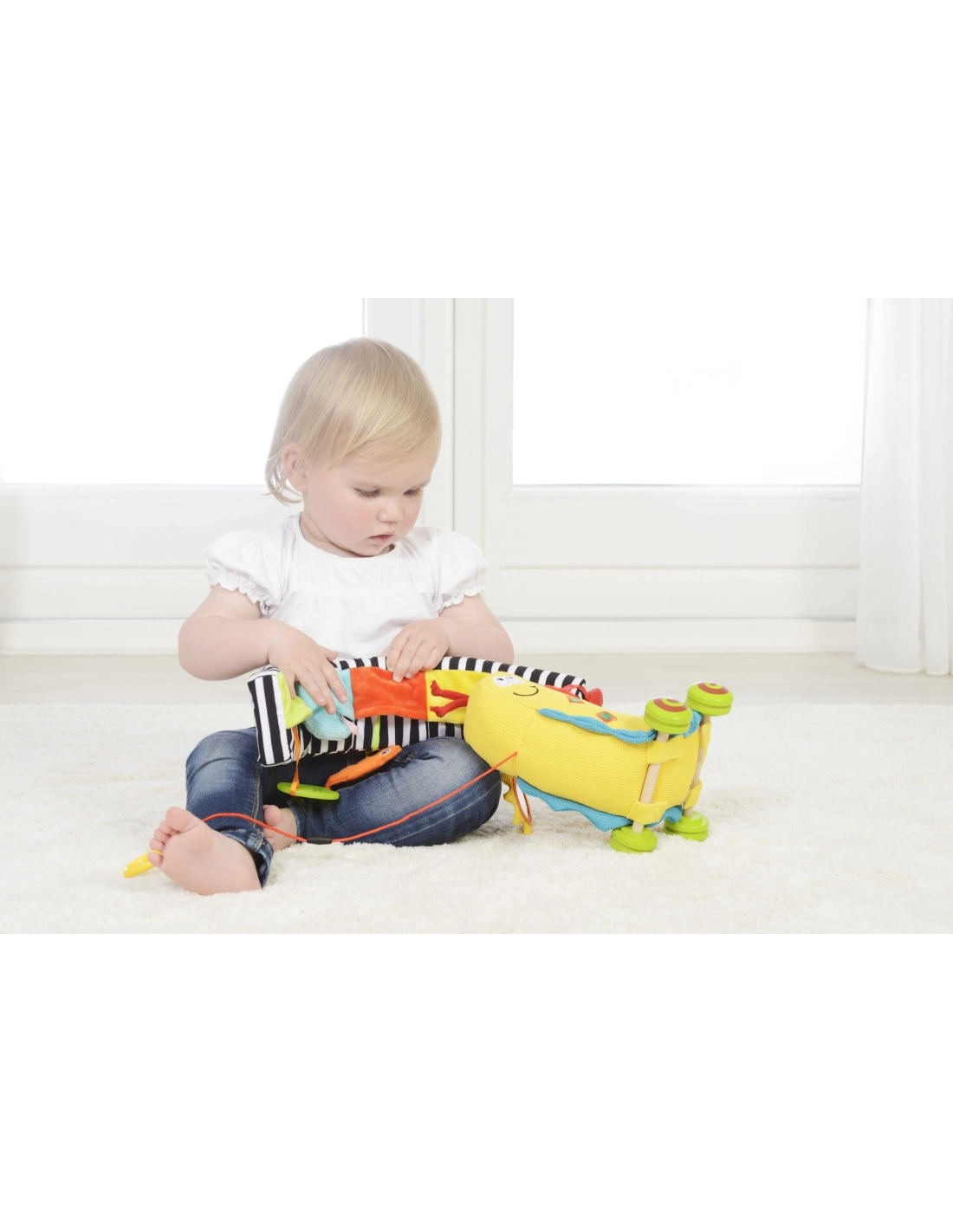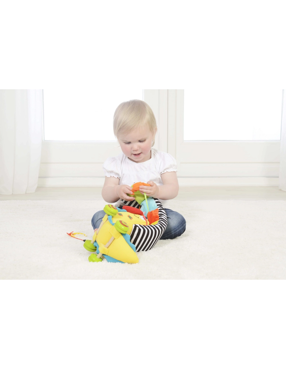 - Entretien facile : roue fixée par velcro, peluche lavable en machine à 30 °C, séchage à l’air libre.