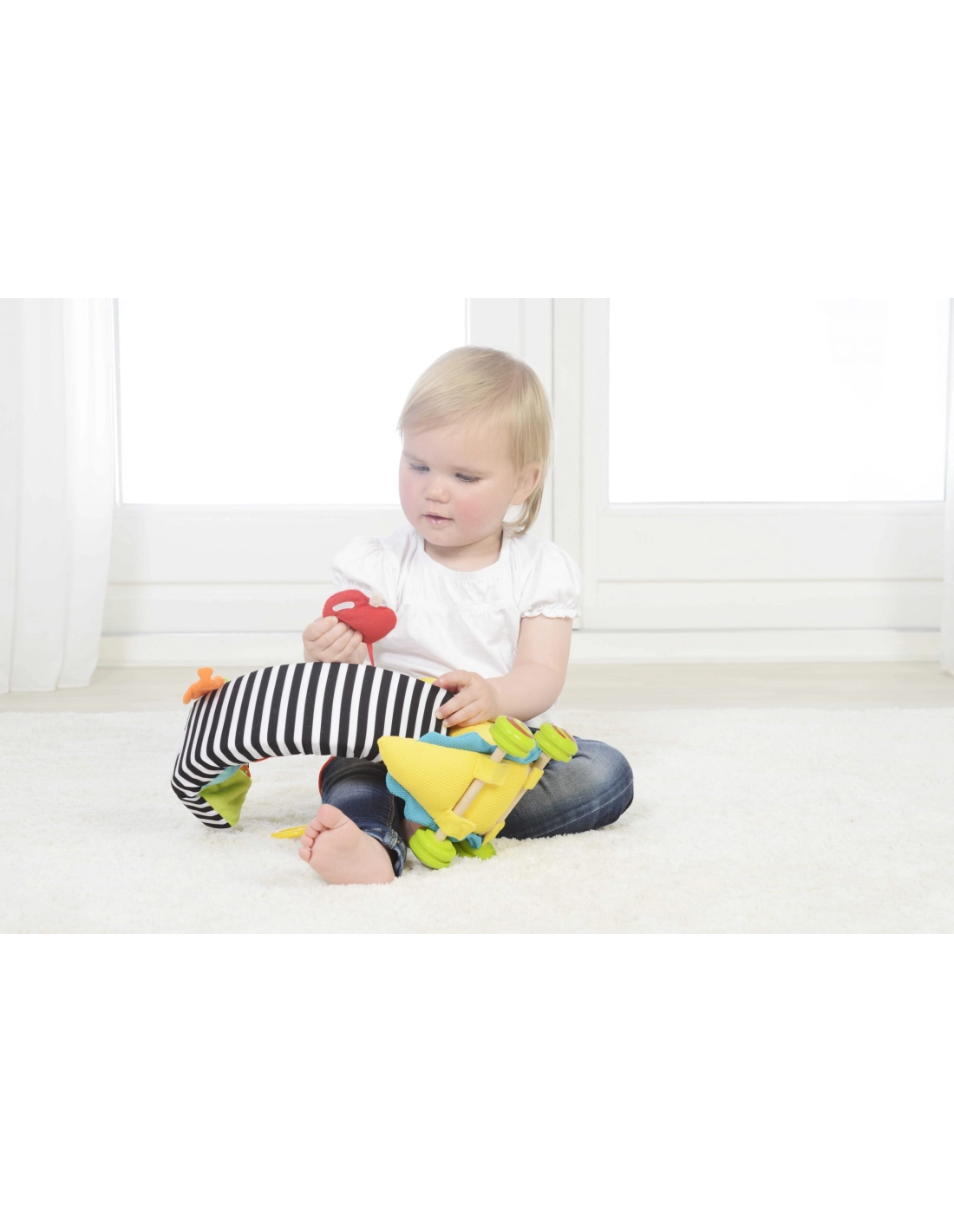 Éveil sensoriel : textures variées, couleurs contrastées et sons doux pour affiner la perception.