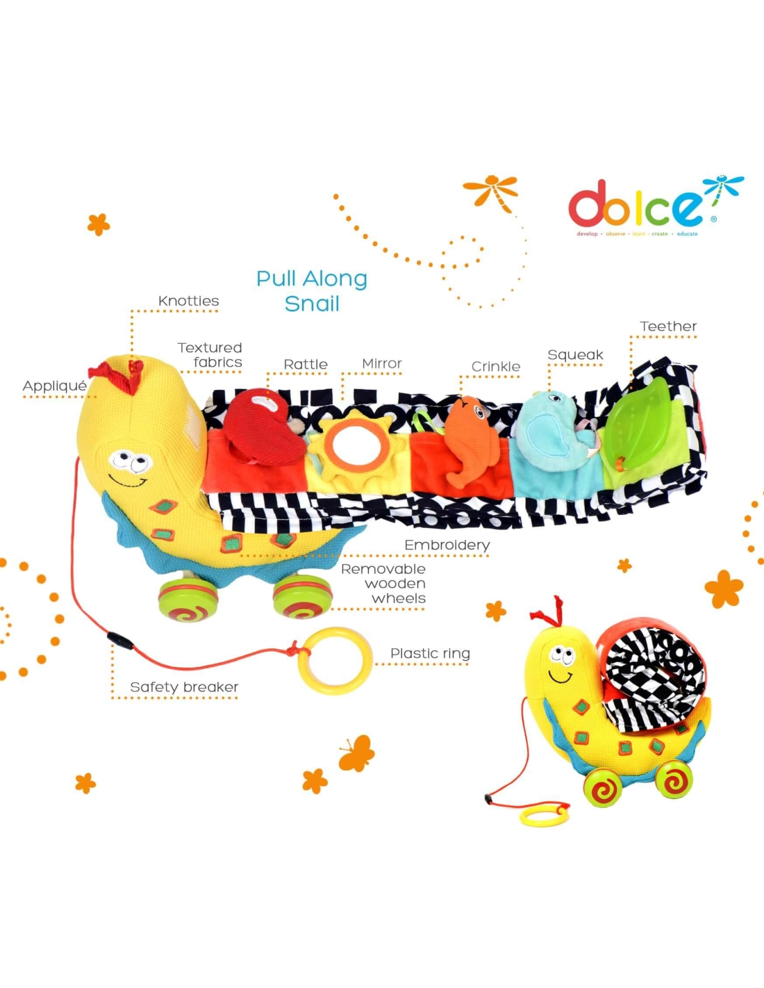 Invitez votre tout-petit à explorer le monde en douceur avec Semmy l’Escargot, jouet à tirer et peluche d’activité 2-en-1. Conçu pour les bébés dès la naissance jusqu’à 24 mois, ce compagnon sensoriel stimule la motricité globale, l’éveil auditif et la coordination main-œil grâce à cinq zones d’exploration : hochet, miroir incassable, élément bruissant, sifflet doux et anneau de dentition sans BPA.