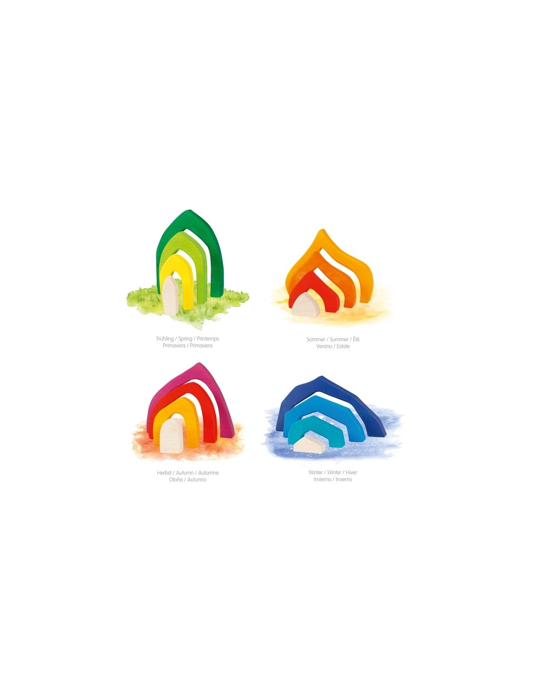 Le coffret de construction Quatre Saisons permet aux enfants de créer des univers inspirés par les couleurs et les atmosphères des quatre saisons : printemps, été, automne et hiver. Chaque ensemble de blocs représente les tons d'une saison, offrant une palette de couleurs qui stimule l'imagination et invite à des jeux créatifs et libres.
