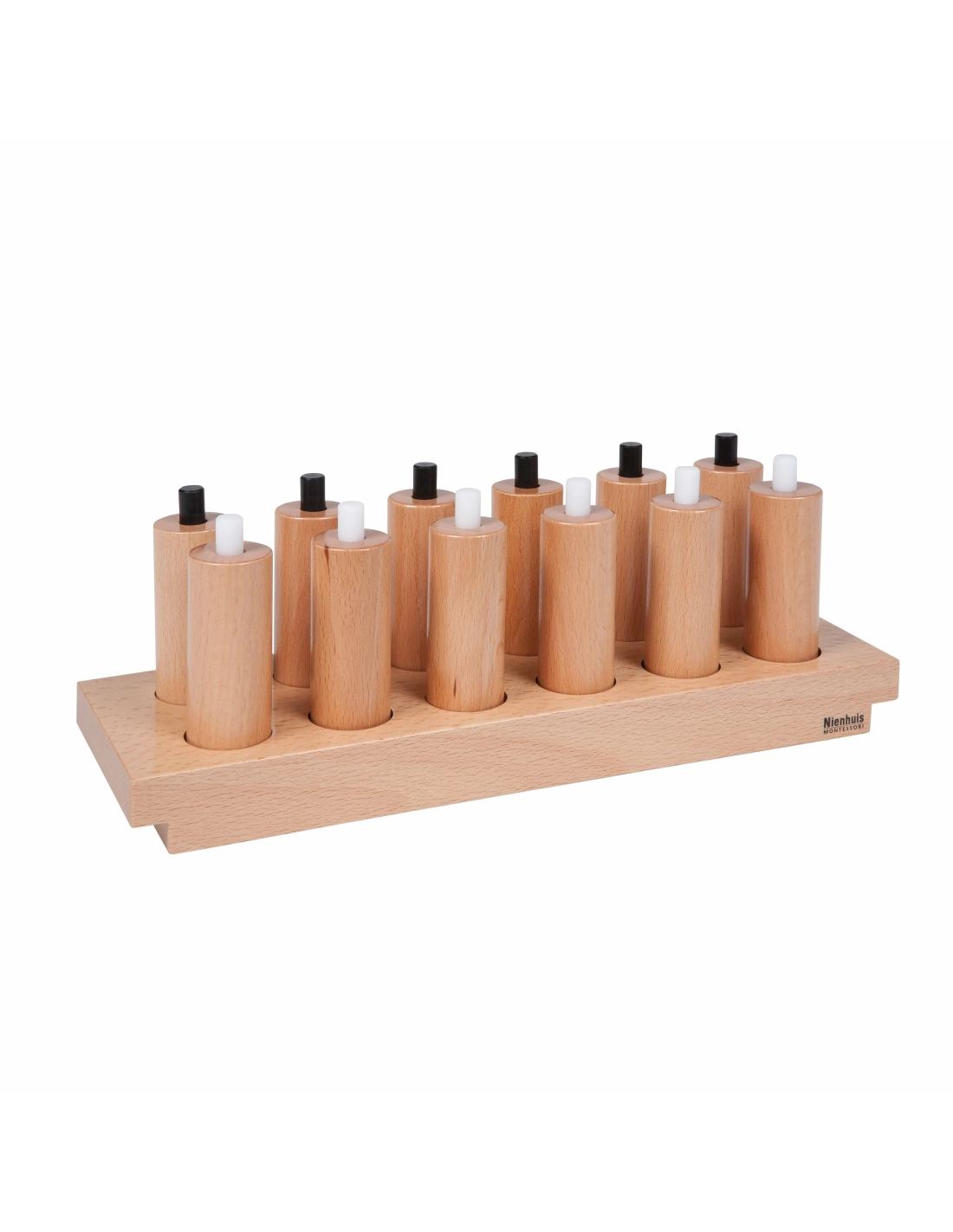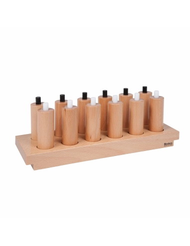 Les cylindres de pression offrent des expériences d'appariement et de gradation des degrés de pression. En appuyant sur les poussoirs à ressort, l'enfant détecte la différence de pression de résistance. Conçu par George Russell.