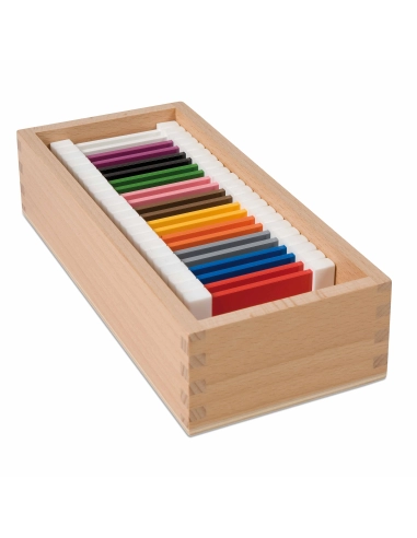 Un matériel Montessori composé d'une boîte et 63 tablettes. Avec la leçon en trois temps Montessori, l'enfant s'approprie le vocabulaire des couleurs. Vous pouvez lui proposer une activité Montessori de mise en paire, des jeux d'association avec objets du quotidien. Cet ensemble offre des couleurs secondaires...