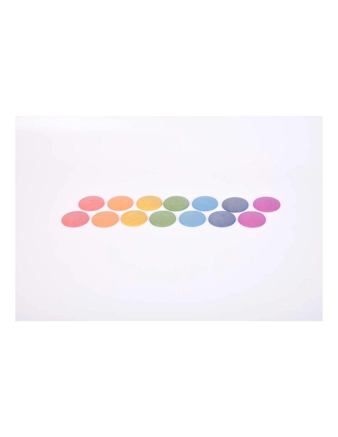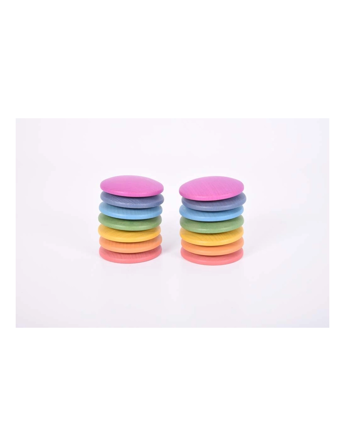 Cet ensemble contient 14 disques en bois avec des sommets arrondis et des bases plates, 2 dans chacune des 7 couleurs de l'arc-en-ciel. Une belle ressource tactile que les jeunes enfants apprécieront d'apprendre à rouler, tourner ou même empiler. À utiliser pour le tri, le comptage et la reconnaissance des couleurs, ou pour améliorer les petites scènes de jeu du monde.