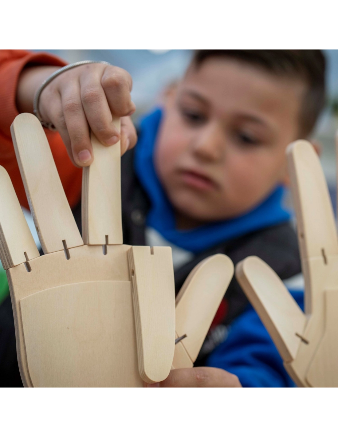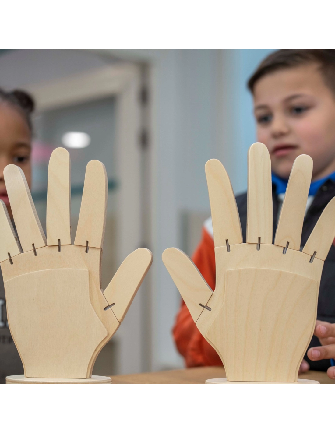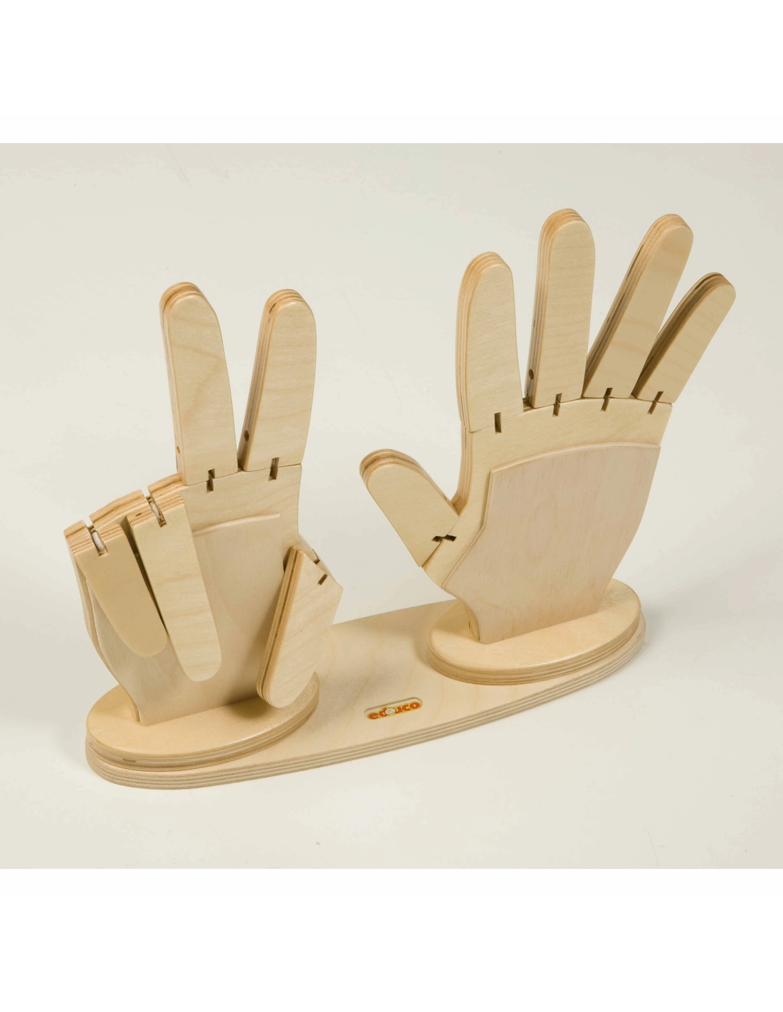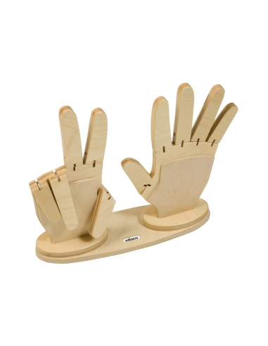 - 2 mains en bois sur une base (25 x 12,5 x 1,5 cm) avec 10 doigts pliables